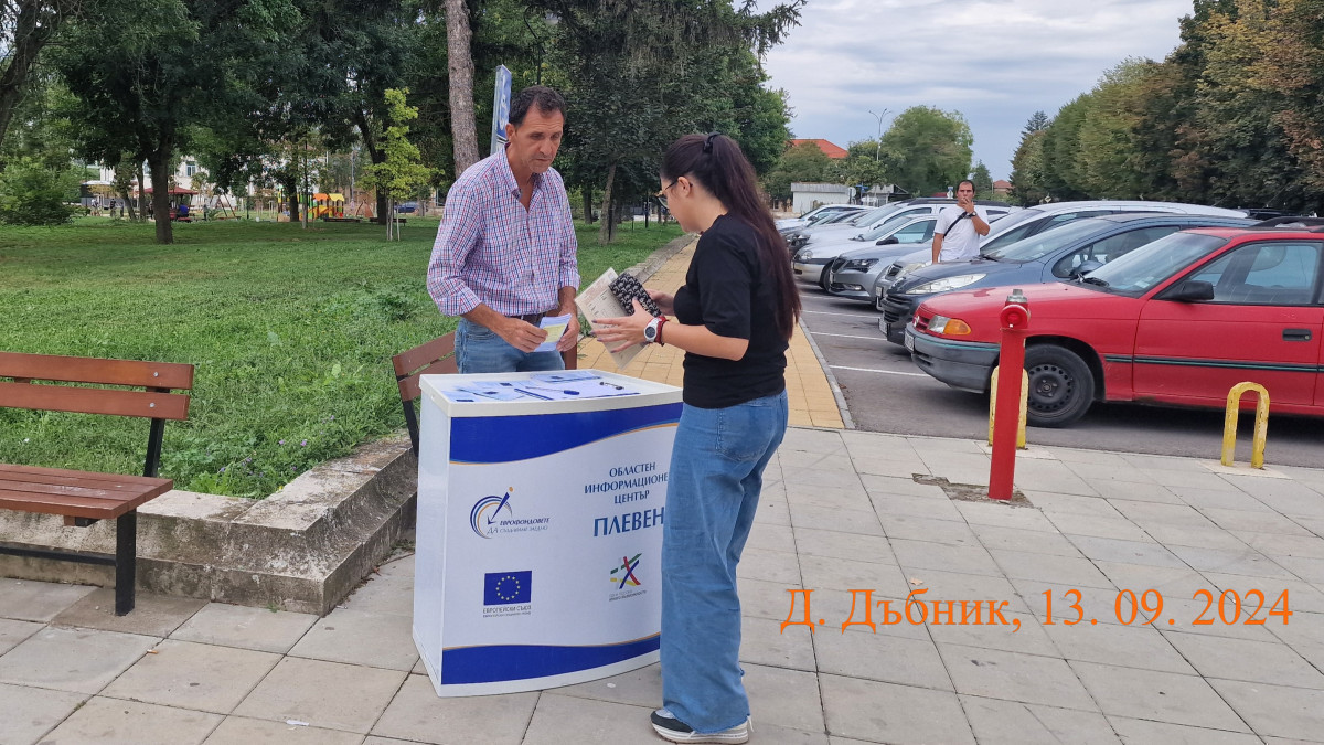 От 11 до 13 септември 2024 г. Игнат Димитров, Костадин Киров и Зоя Иванчева от ОИЦ – Плевен потърсиха диалога с живеещи и работещи в Гулянци, Долна Митрополия, Тръстеник и Долни Дъбник и разясняваха на достъпен език възможностите малки фирми и неправителствени организации да получат безвъзмездна подкрепа за идеите си от европейските фондове.