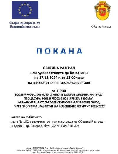 На 27 декември 2024 г. (петък), от 11:00 ч., Община Разград, бенефициент по проект „Грижа в дома в община Разград”, финансиран от Програма „Развитие на човешките ресурси” 2021-2027 г., ще проведе заключителна пресконференция.