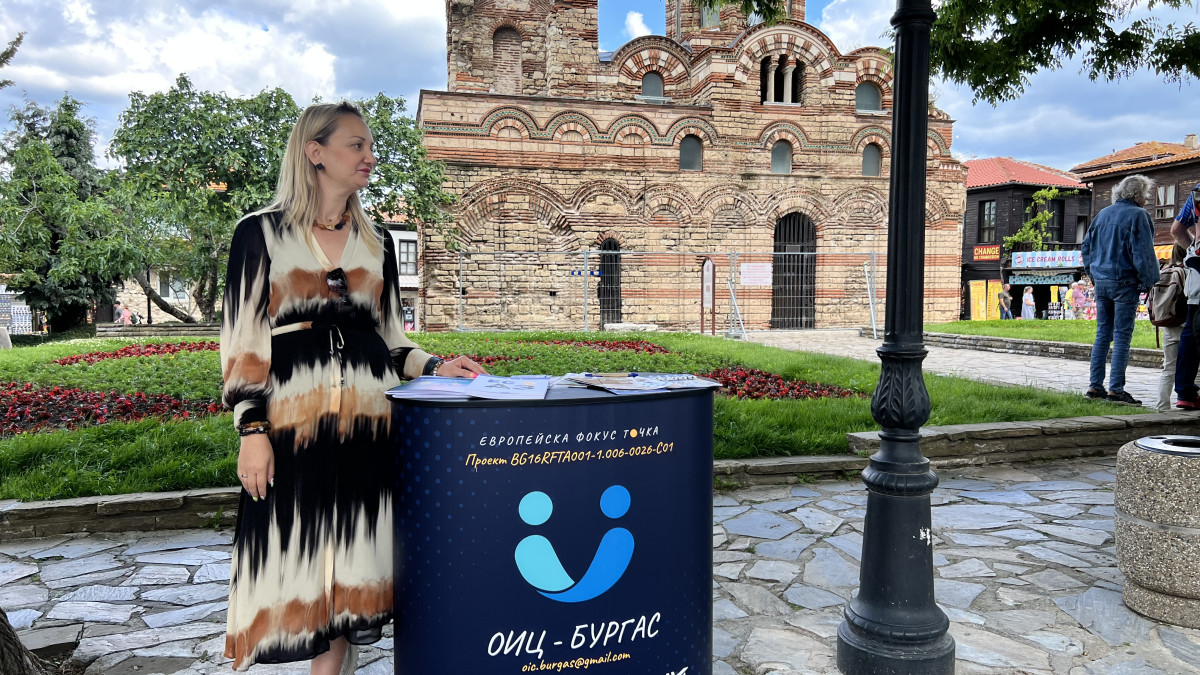 На 28 май /сряда/ с открита приемна в историческия център на Стария град Несебър продължи ежегодната обиколката на Областен информационен център-Бургас в областта. На изнесения щанд, експертите се срещнаха с граждани и гости на града. Най-голям интерес и множество въпроси постъпваха по повод процедурата “Продуктивни инвестиции и иновации в аквакултурите” по Програма за морско дело рибарство и аквакултури за подобряване на конкурентоспособността и жизнеспособността на предприятията в сектора на аквакултурите, включително подобряване на безопасността и условията на труд.