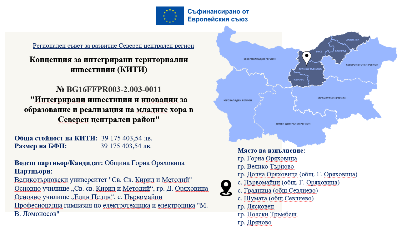 1. BG16FFPR003-2.003-0011 „Интегрирани инвестиции и иновации за образование и реализация на младите хора в Северен централен район“.