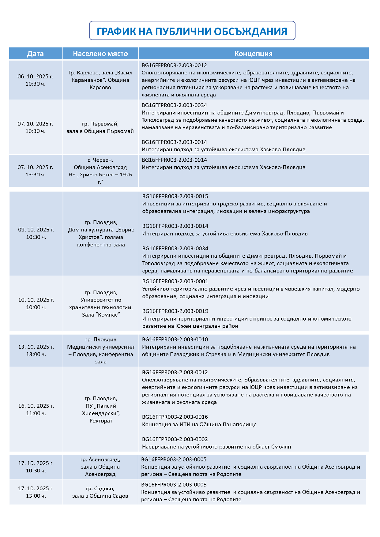 Пред присъстващите беше представен и график на предстоящите публични обсъждания, чиято цел е да проучат нагласите на заинтересованите страни и чрез анкети да се измери обществената подкрепа на местните общности за предложенията. Събитията ще се проведат от 6 до 17 октомври на територията на общините, в които има предвидени дейности. От област Пловдив са подадени две концепции с водещи партньори Община Асеновград и Община Карлово. В останалите концепции партньори са Община Пловдив, Медицински университет – Пловдив, Пловдивски университет „Паисий Хилендарски“, Университет по хранителни технологии – Пловдив, Община Садово, Община Първомай и други.