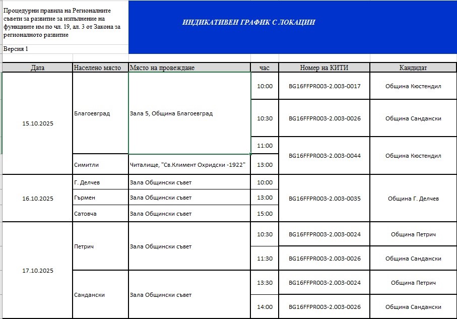 В периода 15-17 октомври 2025 г. Областен информационен център – Благоевград, в качеството му на Звено за публични консултации към Регионалния съвет за развитие (РСР) на Югозападен регион (ЮЗР), ще проведе поредица от публични консултации в Благоевградска област за представяне на концепции за интегрирани териториални инвестиции (КИТИ), преминали успешно проверка на административно съответствие и допустимост.