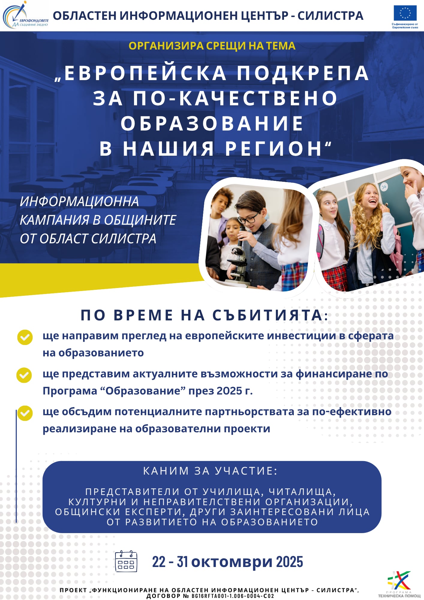 Областен информационен център – Силистра стартира поредица от информационни срещи под надслов „ЕВРОПЕЙСКА ПОДКРЕПА ЗА ПО-КАЧЕСТВЕНО ОБРАЗОВАНИЕ В НАШИЯ РЕГИОН“. Целта на инициативата е да популяризира възможностите за европейско финансиране в сферата на образованието през 2025 година, да представи реализираните до момента проекти, допринесли за модернизиране на учебната среда и качеството на образованието в региона, както и да бъде насърчено партньорството за още по-успешно реализиране на проекти и инициативи. Кампанията ще се реализира в периода от 22 до 31 октомври 2025 г. и включва присъствени събития в общините от област Силистра, като е насочена към училища, читалища, общински експерти и всички заинтересовани от развитието на образованието чрез европейски програми.