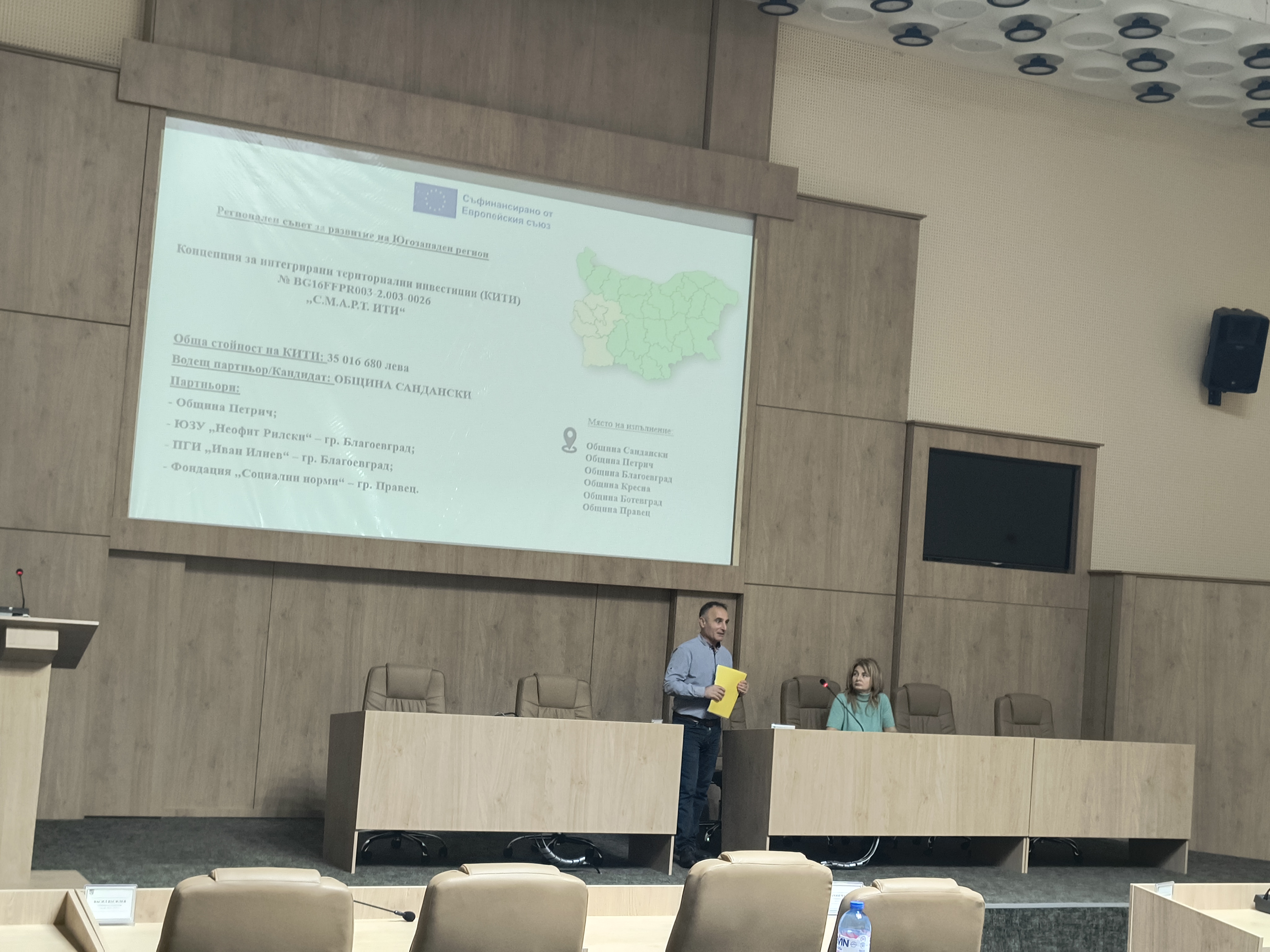 В Ботевград и Правец се проведе обществено обсъждане на интегрирана концепция №  BG16FFPR003-2.003-0026 „С.М.А.Р.Т. ИТИ“ – стъпка напред в устойчивото териториално развитие. Концепцията обхваща 8 общини от Югозападния регион и включва нови технологии и научни изследвания с практическа насоченост. Обединява 1 водещ партньор Община Сандански, и четири партньора-допустими бенефициенти за дейностите - Община Петрич, Югозападен университет „Неофит Рилски“, ПГ по икономика „Иван Илиев“ и Фондация „Социални норми“, които ще изпълняват проекти по 5 финансиращи програми.