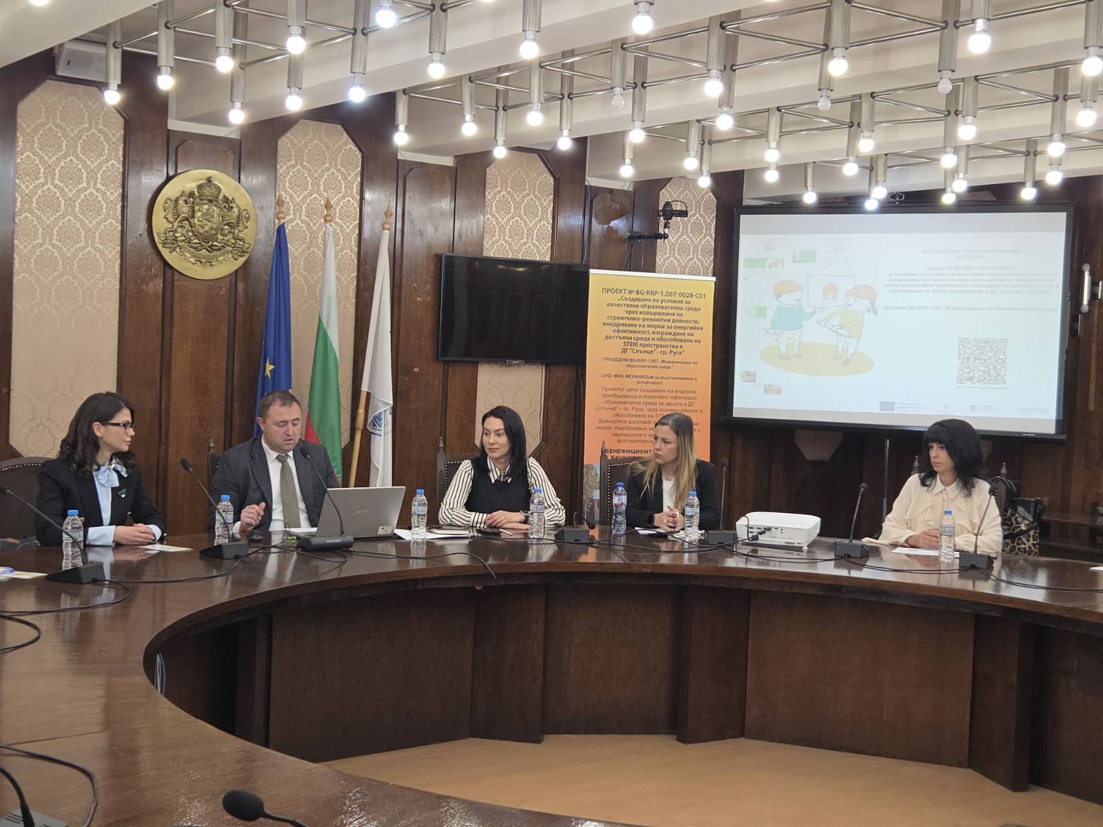 Днес в Заседателната зала на Община Русе се проведе встъпителна конференция по проект BG-RRP-1.007-0028-C01 „Създаване на условия за качествена образователна среда чрез извършване на строително-ремонтни дейности, внедряване на мерки за енергийна ефективност, изграждане на достъпна среда и обособяване на STEM пространства в ДГ „Слънце“ – гр. Русе“.