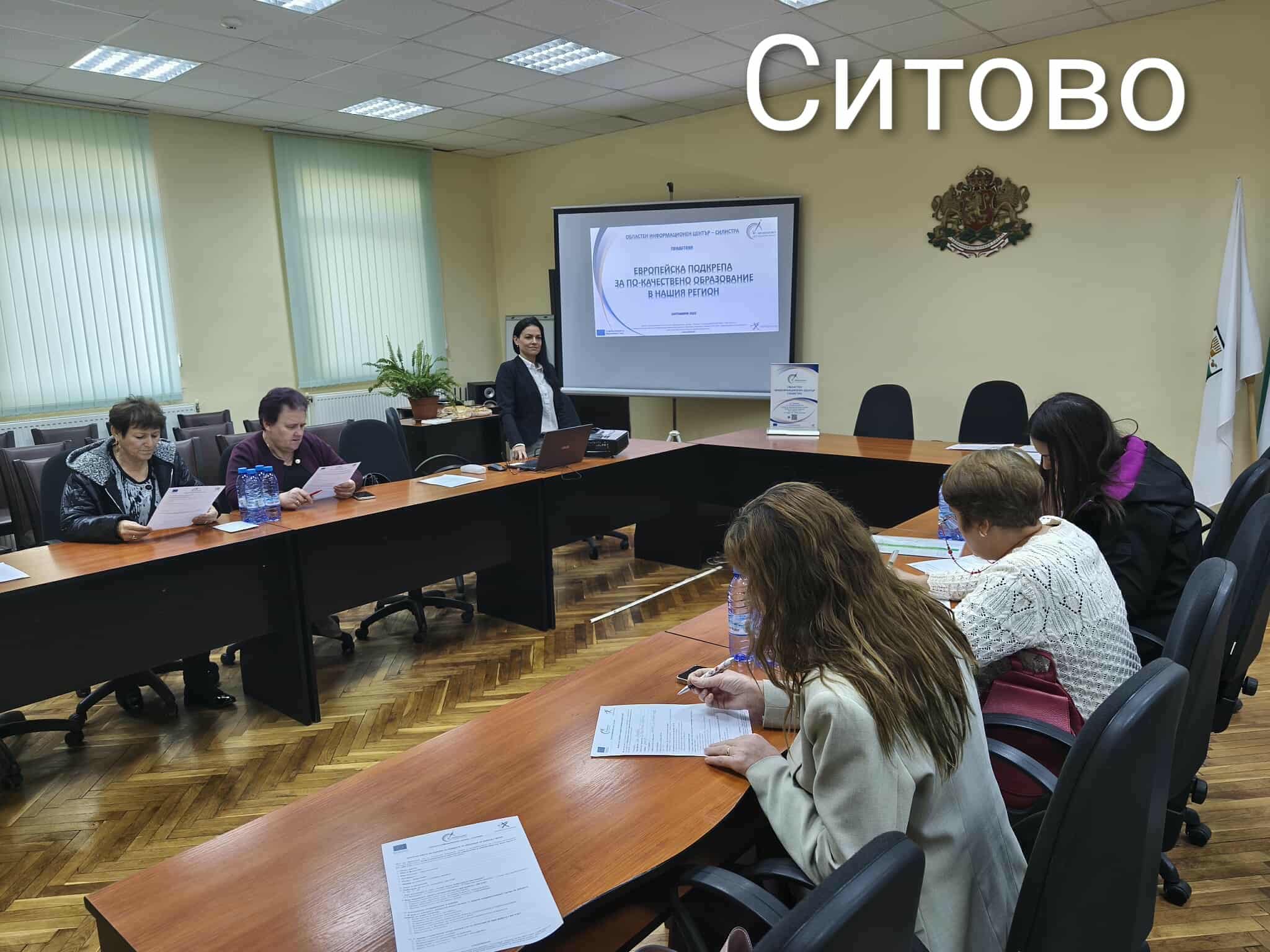 Областният информационен център – Силистра успешно приключи поредицата от информационни срещи под надслов „ЕВРОПЕЙСКА ПОДКРЕПА ЗА ПО-КАЧЕСТВЕНО ОБРАЗОВАНИЕ В НАШИЯ РЕГИОН“, проведени в периода от 22 до 31 октомври 2025 г. Инициативата имаше за цел да представи възможностите за европейско финансиране в сферата на образованието през 2025 г., както и реализираните проекти, допринесли за модернизиране на учебната среда и повишаване на качеството на образованието в област Силистра. Събитията бяха проведени във всички общини от областта, като събраха представители на училища, читалища, общински администрации, педагогически и непедагогически специалисти.