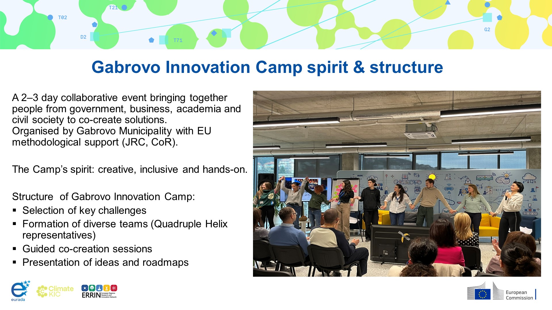 В началото на ноември 2025 г. в София се проведе двудневно практическо обучение – част от Европейската инициатива „Иновации за териториална трансформация“ (Innovation for Place-Based Transformation), организирано от Съвместния изследователски център (JRC) към Европейската комисия с подкрепата на Европейския парламент. Инициативата обединява над 240 територии от цяла Европа, водени от общата амбиция да трансформират своите политики за иновации в отговор на ключови местни и глобални предизвикателства. Сред участниците бяха и представители на Областен информационен център – Габрово, които споделиха опита си чрез утвърдената местна инициатива „Лагер за иновации - Габрово“.