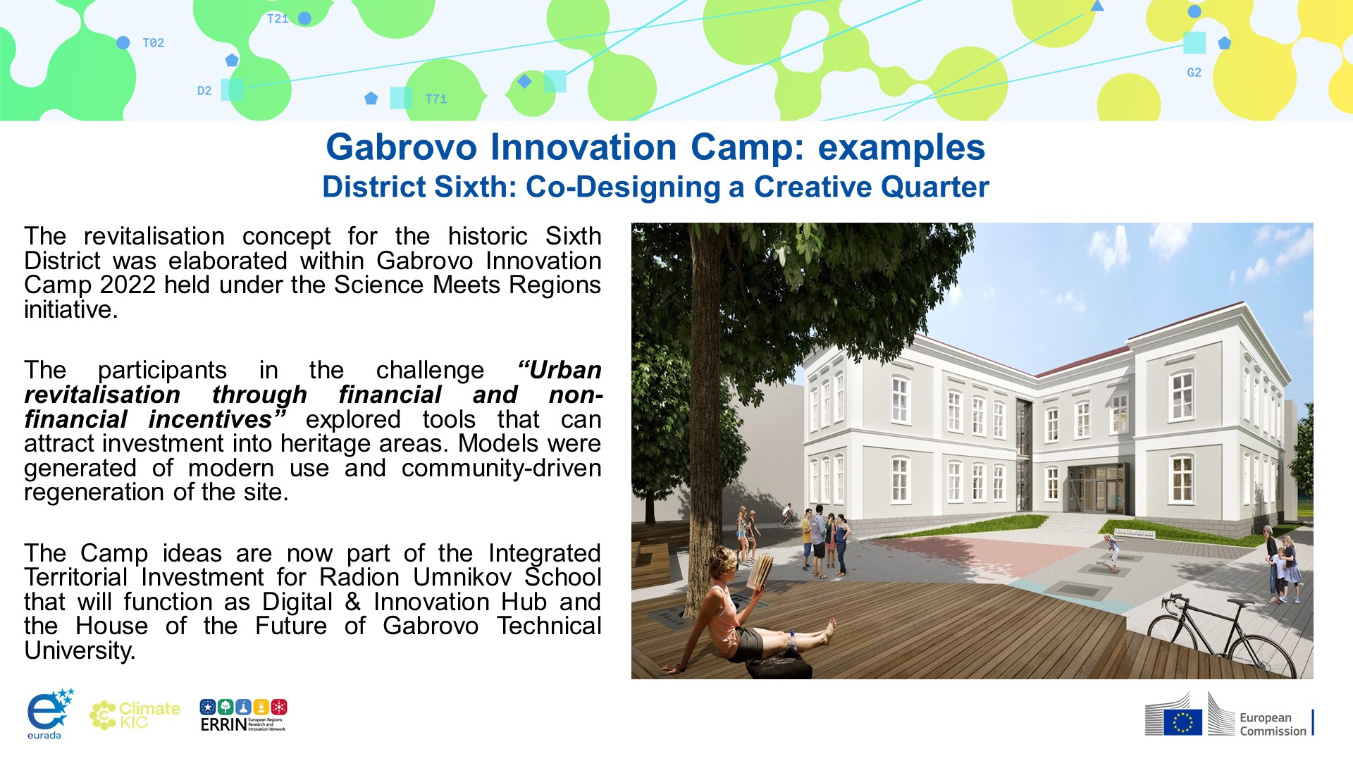 В по-новите си издания „Лагерът за иновации“ в Габрово гененерира прототипи, които вече преминават към реализация с подкрепата на европейските фондове при споделено управление. В изданието през 2022 г. се разработи концепция за възраждането на историческия квартал „Шести участък“. Концепцията "Шест идеи за Шести участък", създадена по време на лагера, намира реално изражение в ИТИ „Габрово – център на иновации, образование и предприемачество“. С неговото изпълнение Община Габрово започва трансформацията на сградата на бившето училище „Радион Умников“ в Център за дигитални умения и иновации. В него ще бъдат създадени лаборатории по автоматизация и виртуална реалност, оборудвани с индустриални роботи, CRM софтуер и VR технологии. Паралелно с това, в сътрудничество с Технически университет – Габрово, се предвижда създаването на споделено простроство в историческия квартал и изграждането на Къща на бъдещето, интегрираща образование, наука и предприемачество в услуга на местната икономика. Проектът се реализира с комбинирано финансиране по Програмите „Развитие на регионите“, „Развитие на човешките ресурси“ и Програма „Научни изследвания, иновации и дигитализация за интелигентна трансформация “ 2021-2027.
