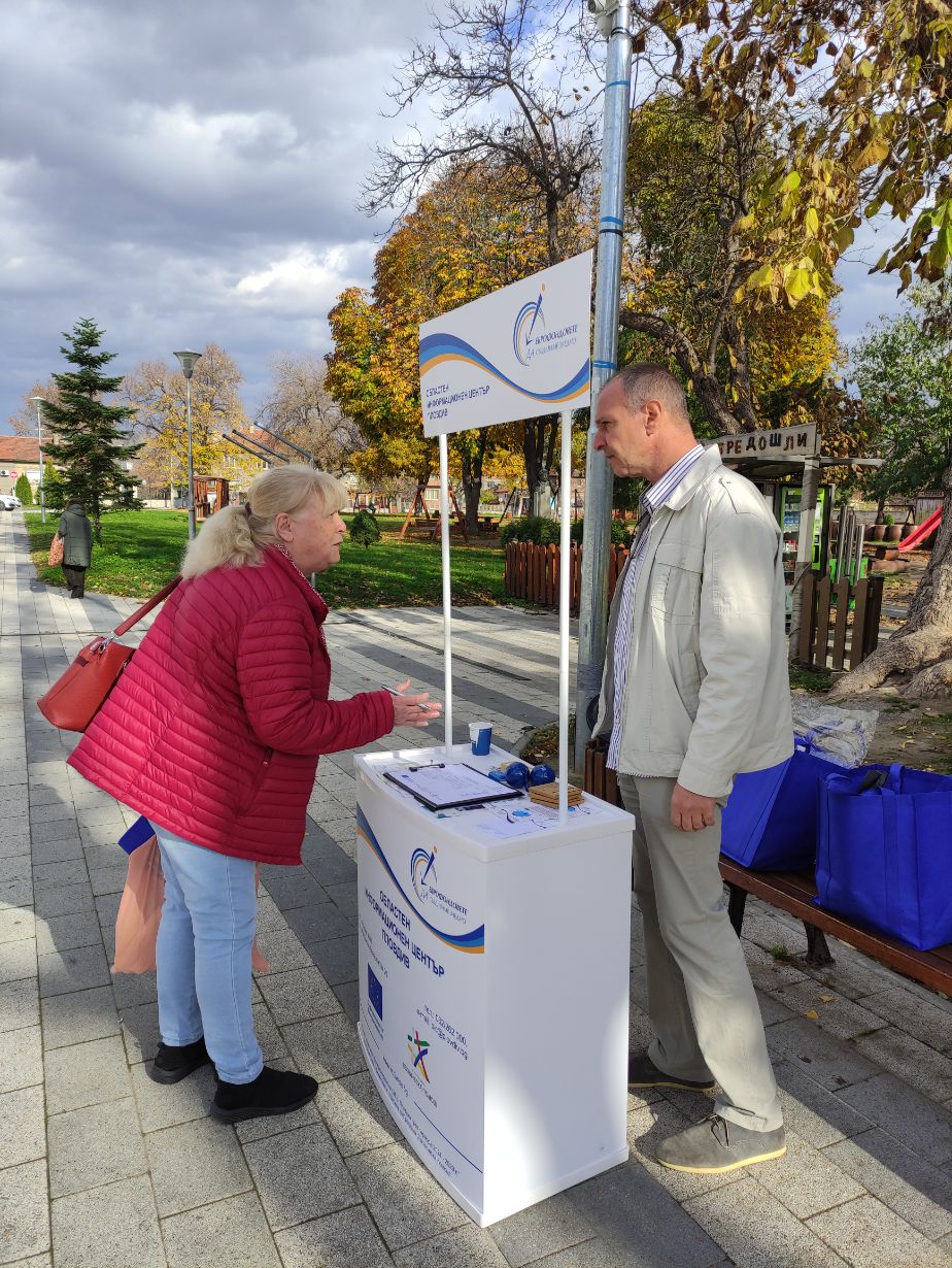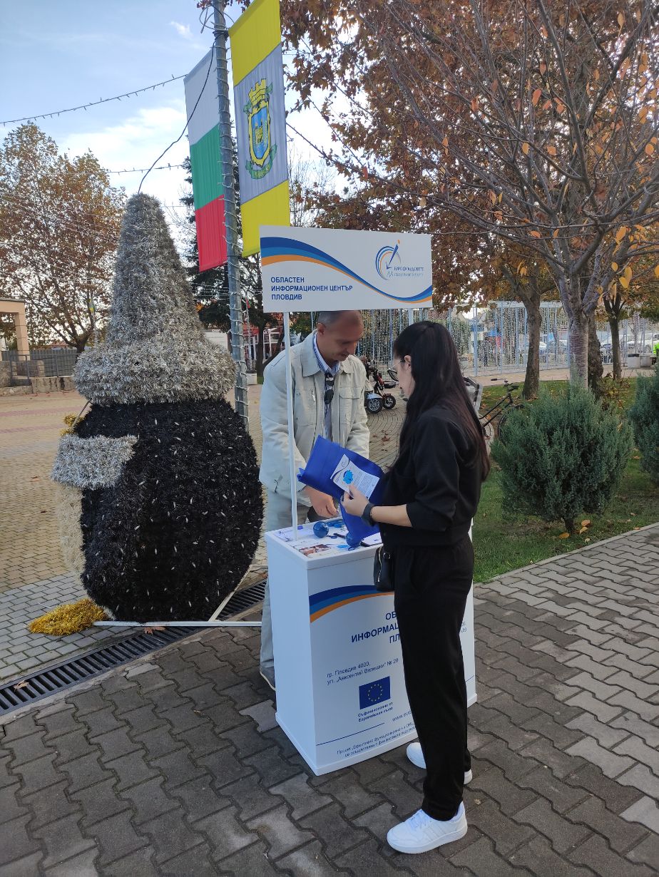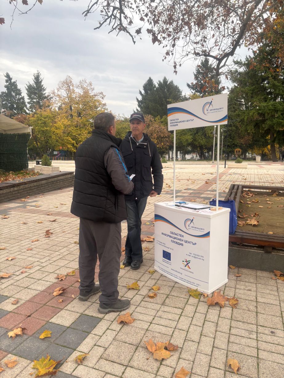 В периода 18 – 21 ноември 2025 г., екипът на Областен информационен център – Пловдив проведе открити приемни в четири населени места в областта. Гражданите на Перущица, Раковски, Стамболийски и с. Труд, община Марица, можеха да открият брандирания щанд на ОИЦ-Пловдив от 10:30 до 12:00 часа в посочените дни, където получиха безплатна информация относно актуалните и предстоящи възможности за финансиране от програмите, съфинансирани от Европейските фондове при споделено управление за периода 2021 – 2027 г., както и подхода Водено от общностите местно развитие.