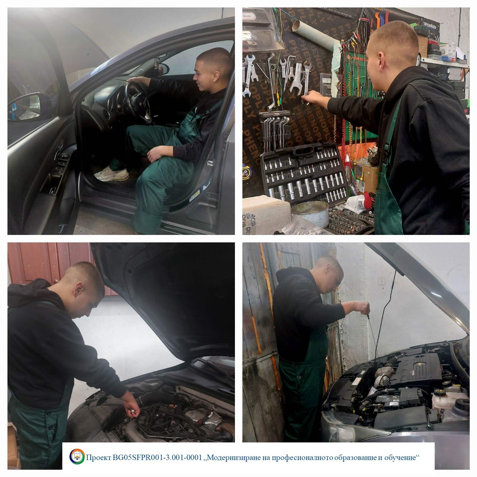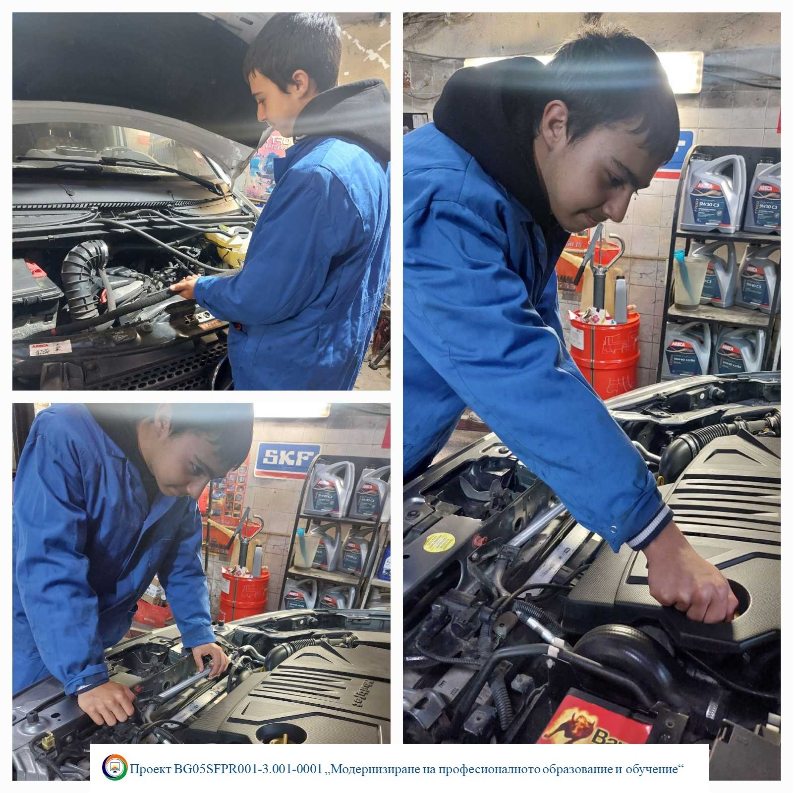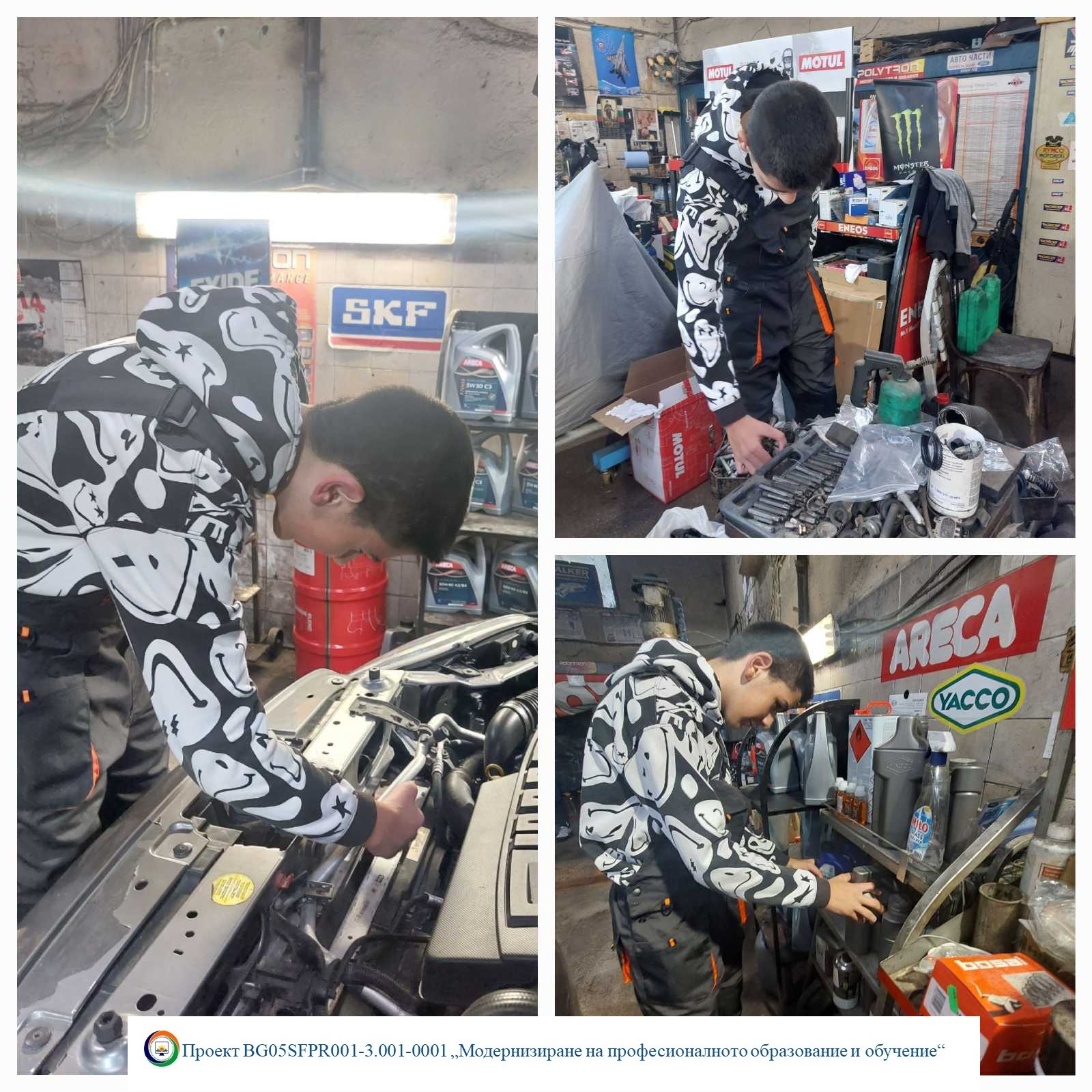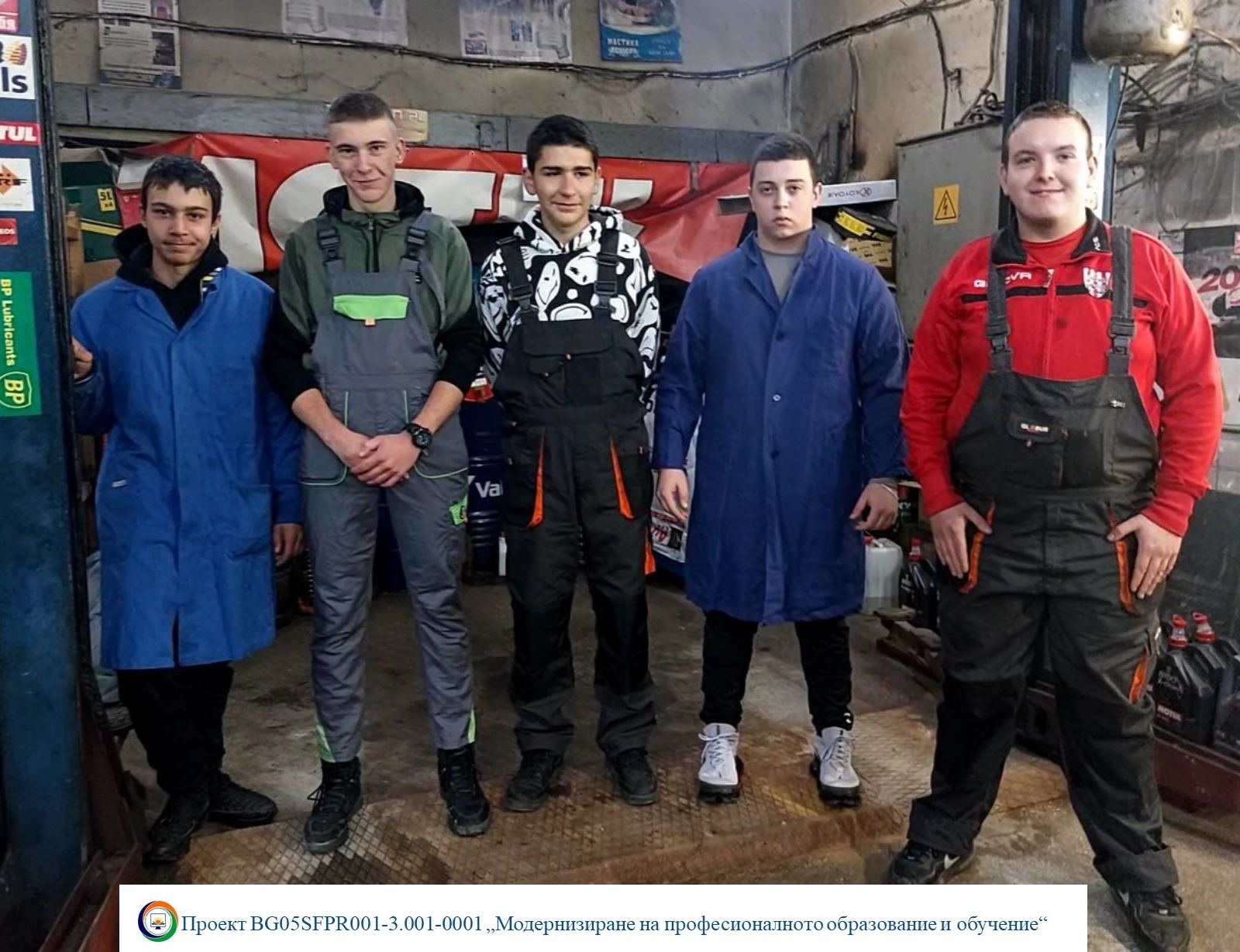 След запознаване с работното облекло и правилата за здравословни и безопасни условия на труд при работа в автосервиз започна провеждането на практическото обучение на групи ученици от 10 и 11 клас, специалност „Автотранспортна техника” в реална работна среда.