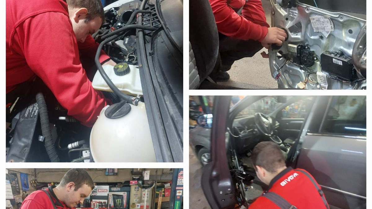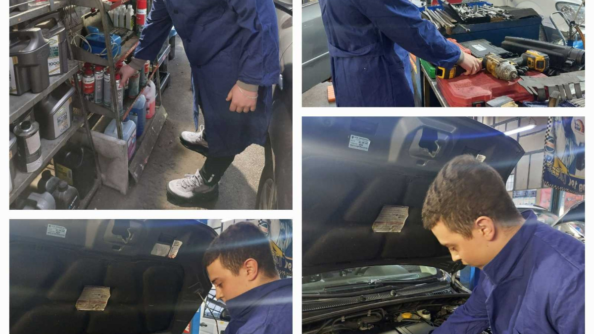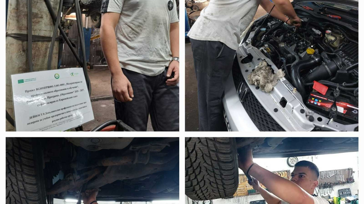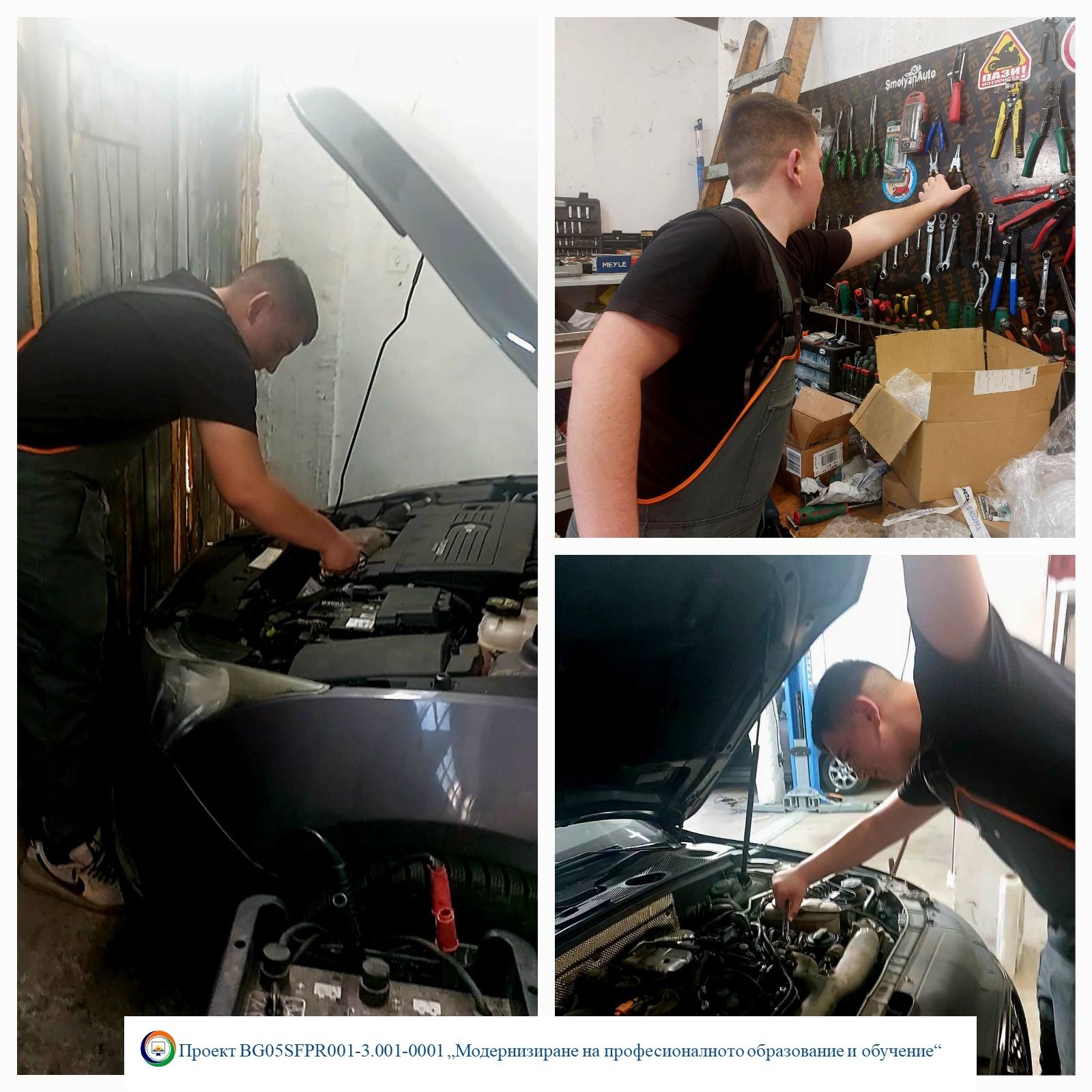 След запознаване с работното облекло и правилата за здравословни и безопасни условия на труд при работа в автосервиз започна провеждането на практическото обучение на групи ученици от 10 и 11 клас, специалност „Автотранспортна техника” в реална работна среда.