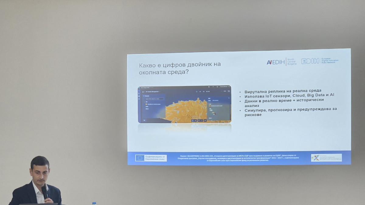 Последва демонстрация на цифров близнак за мониторинг на околната среда, разработен със съдействието на Техническия университет – Габрово и общината, както и представяне на учебни програми и инструмент за диагностика на дигитални таланти, който подпомага организациите при планиране и развитие на квалифицирани кадри.
