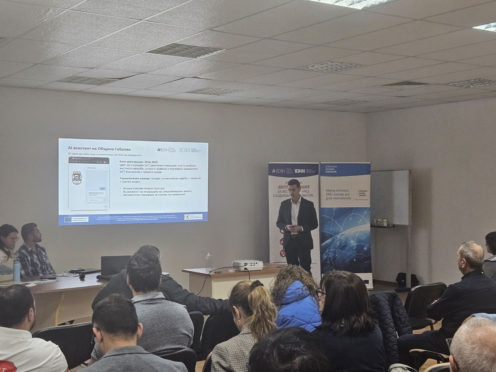 В следващия панел експертът на хъба Светослав Матев представи услугите, които ЕЦИХ предлага на бизнеса и администрацията – сред тях тестове преди инвестиция, оценка на цифрова зрялост, абонаментни внедрявания, обучения и лабораторни демонстрации. Особен акцент бе поставен върху факта, че микро, малките и средните предприятия имат достъп до тези услуги безвъзмездно като форма на държавна помощ „de minimis“, което значително намалява бариерите за внедряване на иновации.