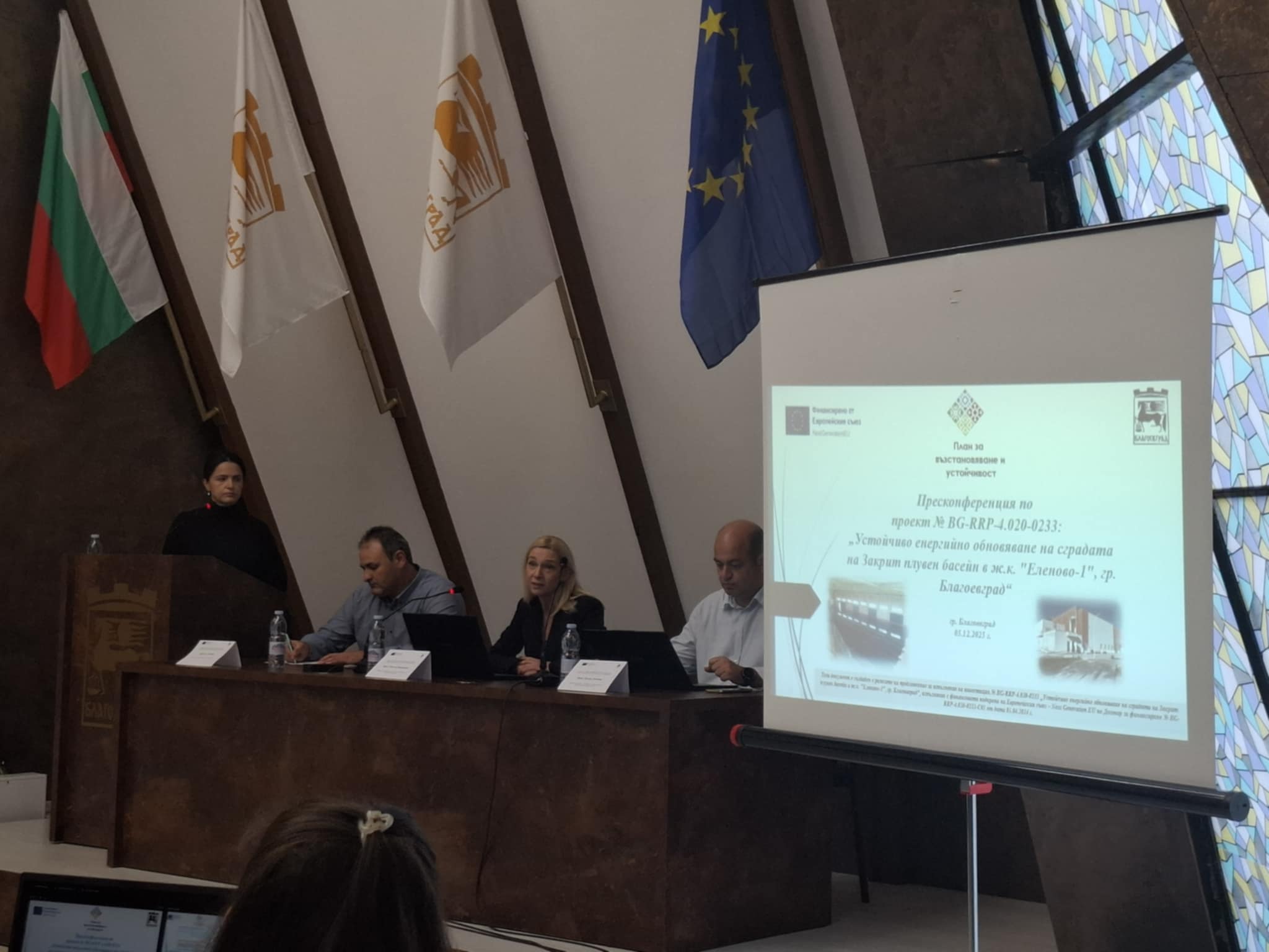 Основните дейности по проект "Устойчиво енергийно обновяване на сградата на Закрит плувен басейн в ж.к. „Еленово-1“, гр. Благоевград“ бяха представени по време на начална пресконференция днес. Ремонтът на спортното съоръжение включва мерки за енергийна ефективност, целящи постигане на по-висок клас на енергопотребление. Очаква се и ограничаване на отрицателното въздействие върху околната среда чрез намаляване на вредните емисии и подобряване на качеството на въздуха.