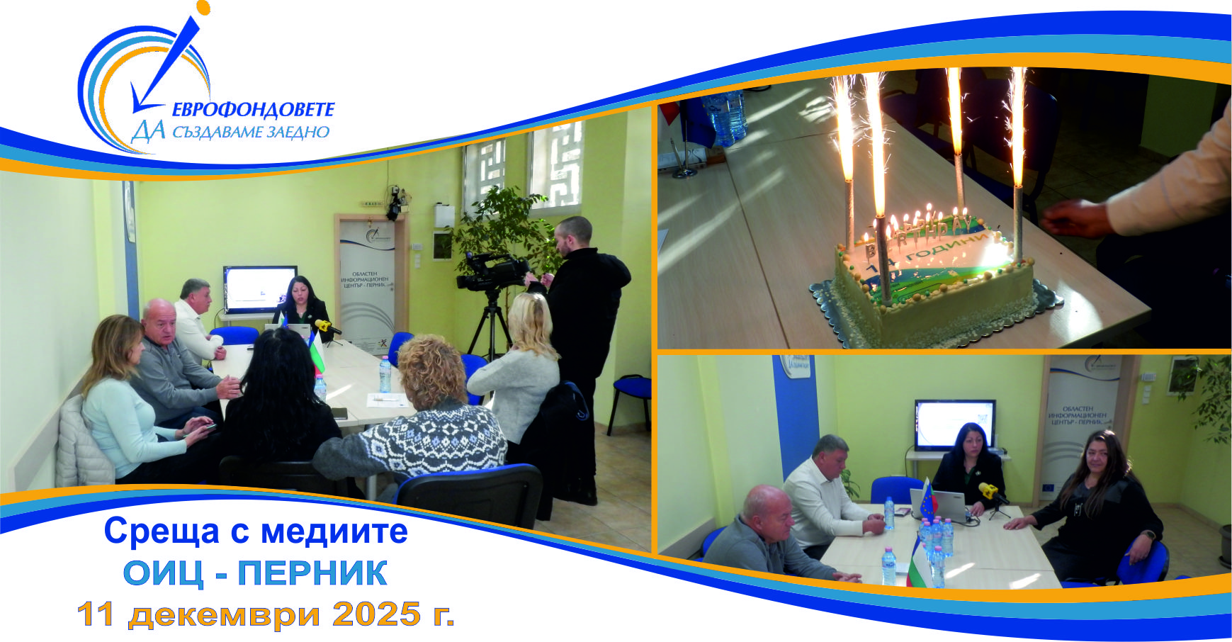 На среща за проактивна работа с представители на електронни и печатни регионални медии, екипът на ОИЦ – Перник отбеляза своя 14-ти рожден ден с празнична торта и свещички. От създаването си през далечната 2011 г., Инфоцентърът се утвърди като надежден източник на информация, касаеща Европейските фондове за споделено управление и като част от Мрежата от областни информационни центрове, популяризира през годините Кохезионната политика на Европейския съюз.