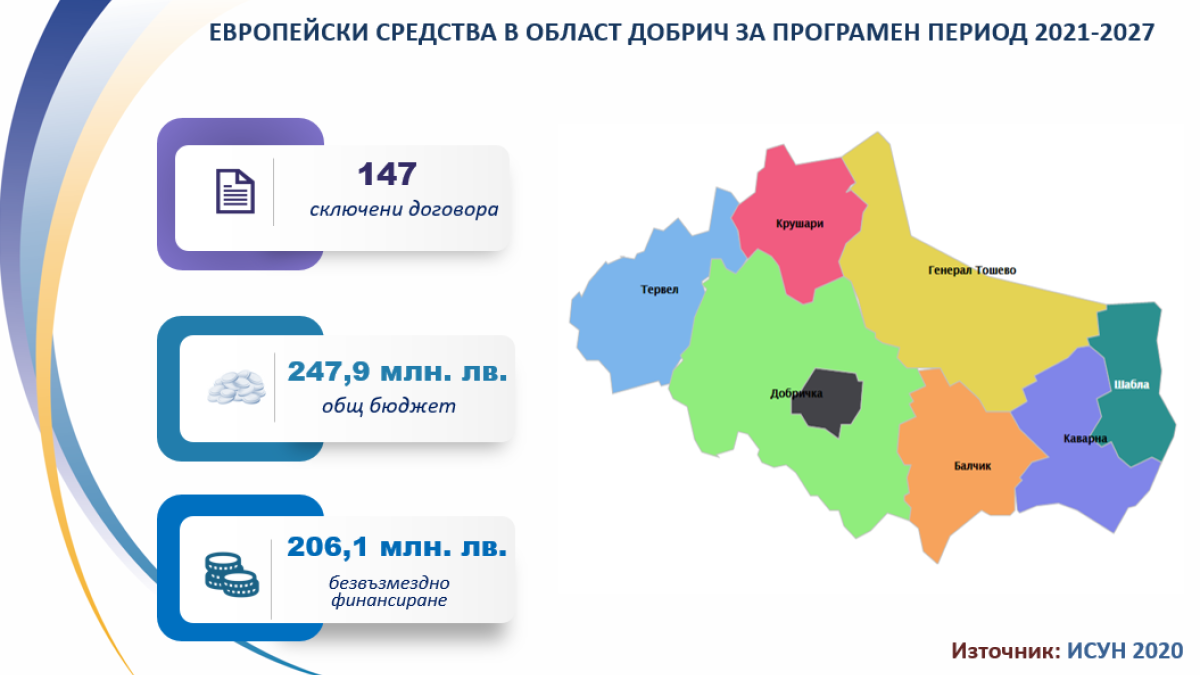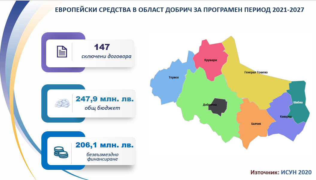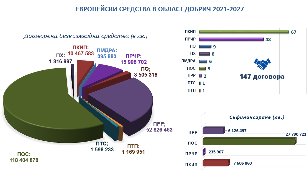 Бизнесът в областта е подписал договори за 10,4 млн. лв. БФП, осигурени от Програма „Конкурентоспособност и иновации в предприятията“ 2021-2027 (ПКИП) за повишаване на конкурентоспособността на 66 предприятия чрез инвестиции в производството, разработване и внедряване на иновации. Програма „Образование“ 2021-2027 подкрепя с 3,5 млн. лв. БФП интеркултурни образователни дейности за над 1500 деца и ученици от областта и дуално обучение в две професионални гимназии. Програма „Транспортна свързаност" 2021-2027 е осигурила 1,1 млн. лв. за радарна мрежа на пристанищен терминал Балчик. Близо 400 хил. лв. е предоставила Програма „Морско дело, рибарство и аквакултури“ 2021-2027 за прекратяване на риболовните дейности на 5 плавателни съда. С подкрепата на Програма „Техническа помощ“ 2021-2027 г., екипът на Областен информационен център - Добрич ще продължи да предоставя безплатна експертна информация за възможностите за финансиране с европейски средства на потенциалните бенефициенти.