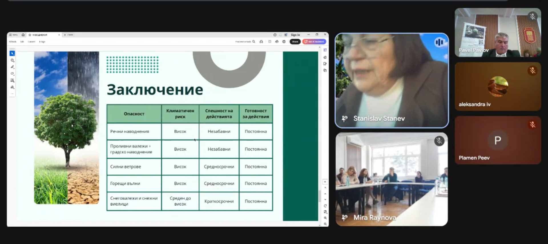 Александра Златева, експерт по проекта, обърна внимание и на дългосрочните рискове за региона – засушаване; ерозия на почвата; и редки, но интензивни валежи. Според нея необходимите мерки включват преди всичко промени в действащите планове за защита при бедствия и аварии.