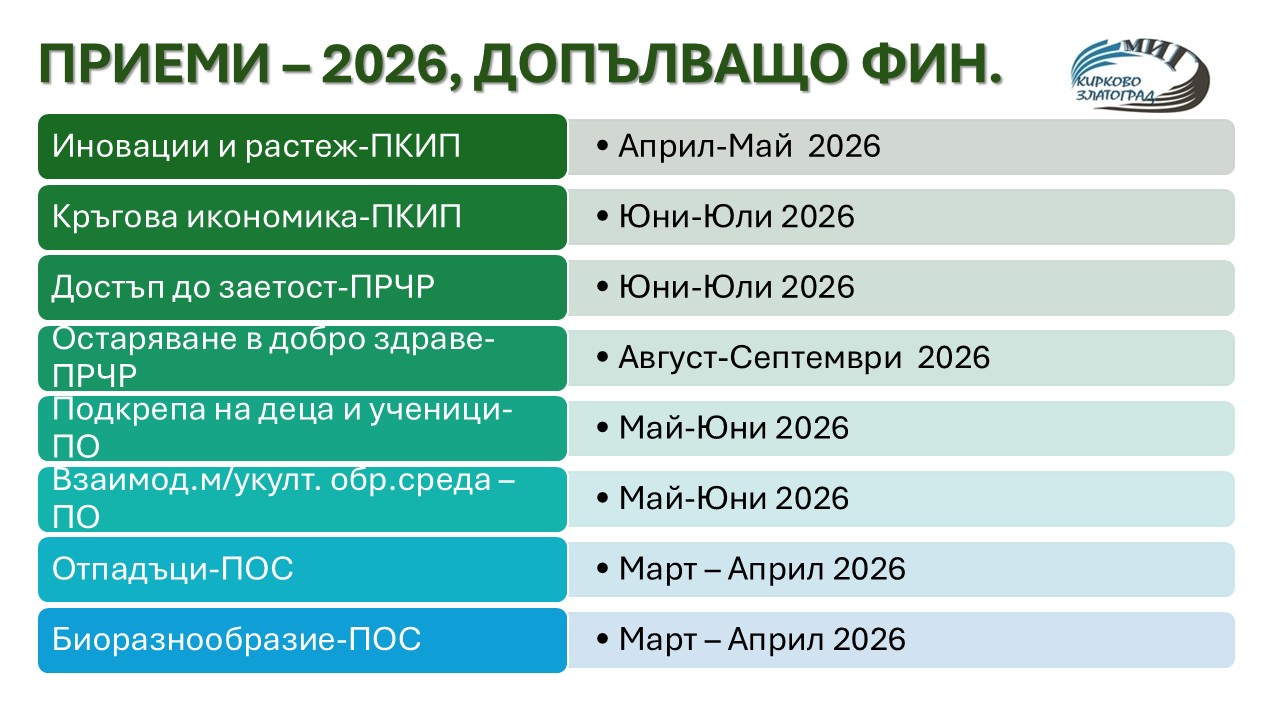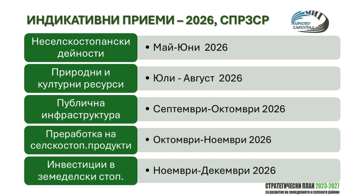 Периодът 2026 – 2027 г. се очертава като ключов за прием на проектни предложения чрез МИГ "Кирково‑Златоград". Тогава се очаква най-голяма активност по отношение на кандидатстването и реализацията на проекти в подкрепа на местното развитие.