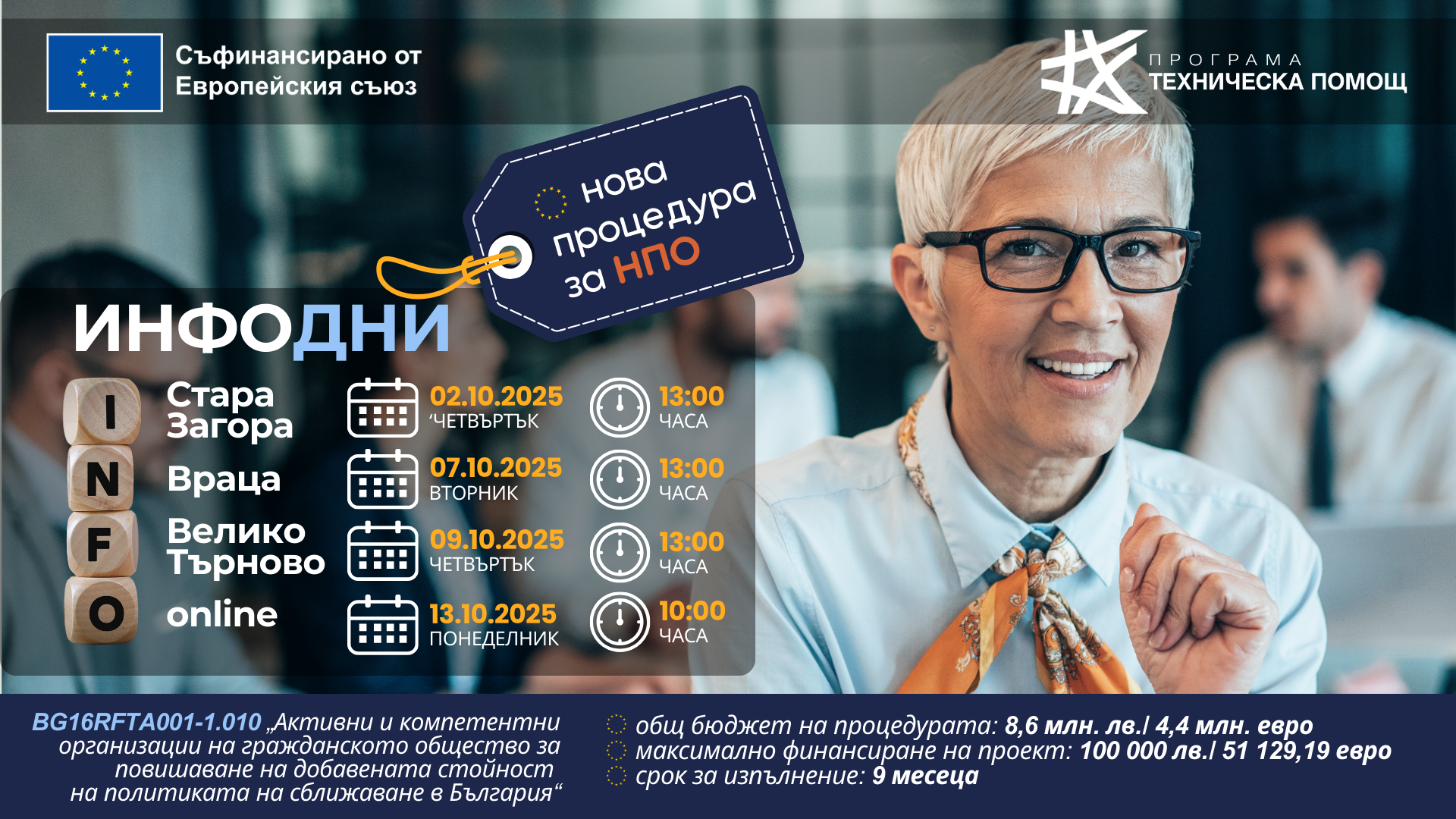 Управляващият орган на Програма „Техническа помощ“ организира информационни дни по Процедура BG16RFTA001-1.010 „Активни и компетентни организации на гражданското общество за повишаване на добавената стойност на политиката на сближаване в България“. Събитията ще се проведат присъствено в градовете Враца, Стара Загора и Велико Търново, както и онлайн.
