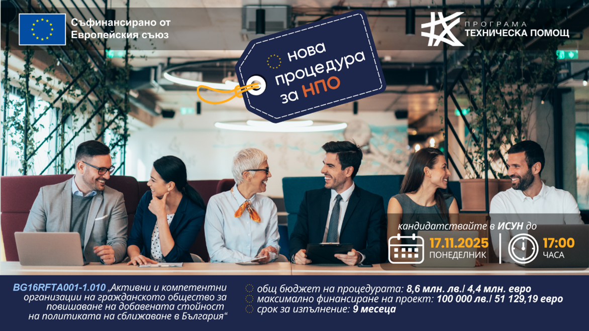 Процедура BG16RFTA001-1.010 „Активни и компетентни организации на гражданското общество за повишаване на добавената стойност на политиката на сближаване в България“ се реализира с финансовата подкрепа на Програма „Техническа помощ“, съфинансирана от Европейския съюз