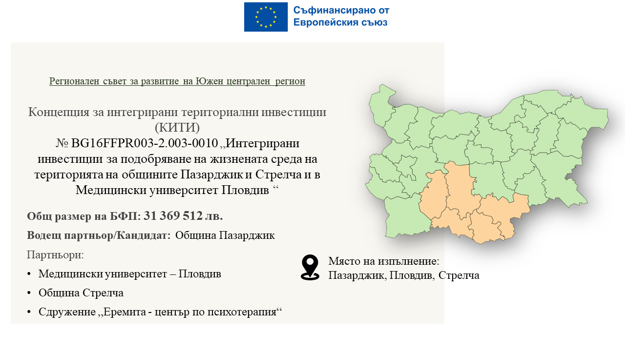 Моля да попълните онлайн анкетата за КИТИ „Интегрирани инвестиции за подобряване на жизнената среда на територията на общините Пазарджик и Стрелча и в Медицински университет Пловдив“ на следния линк: https://forms.gle/TRaLGSFGvG5xxccy9