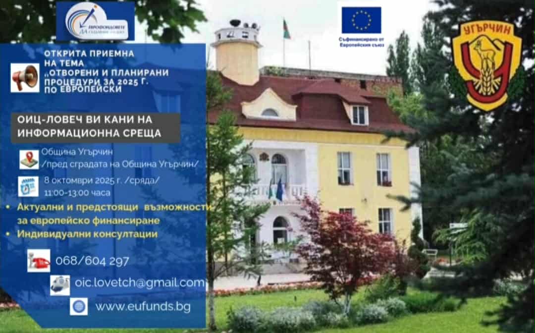 На 08 октомври 2025 г./сряда/, от 11:00 ч., Областен информационен център – Ловеч ще проведе публично информационно събитие на открито в град Угърчин. Изнесеното събитие на ОИЦ-Ловеч ще е на тема: „Отворени и планирани процедури за 2025 г. по европейски и национални програми“. Мобилният щанд на Областния център ще бъде разположен на централния площад, пред сградата на Община Угърчин, в интервала 11:00 – 13:00 ч.