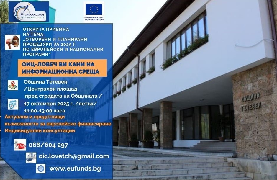 На 17 октомври 2025 г. (петък), от 11:00 ч., Областен информационен център – Ловеч ще проведе публично информационно събитие на открито в град Тетевен. Изнесеното събитие на ОИЦ-Ловеч ще е на тема: „Отворени и планирани процедури за 2025 г. по европейски и национални програми“. Мобилният щанд на Областния център ще бъде разположен на Централния площад пред сградата на общината, в интервала 11:00 – 13:00 ч.