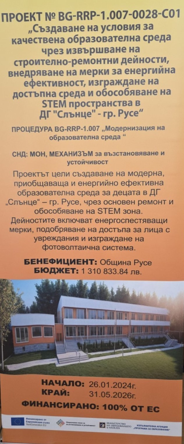 Бенефициент на проекта е Община Русе, а обект на интервенция е ДГ „Слънце“ – гр. Русе, находяща се на ул. „Шейново“ №14.