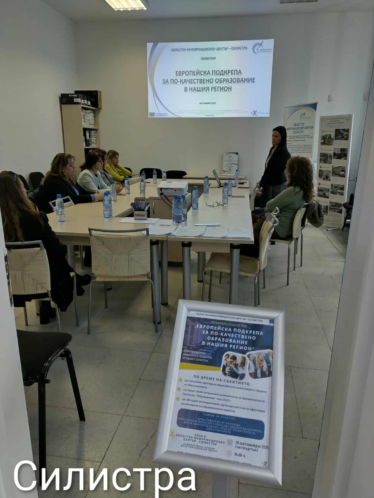 Областният информационен център – Силистра успешно приключи поредицата от информационни срещи под надслов „ЕВРОПЕЙСКА ПОДКРЕПА ЗА ПО-КАЧЕСТВЕНО ОБРАЗОВАНИЕ В НАШИЯ РЕГИОН“, проведени в периода от 22 до 31 октомври 2025 г. Инициативата имаше за цел да представи възможностите за европейско финансиране в сферата на образованието през 2025 г., както и реализираните проекти, допринесли за модернизиране на учебната среда и повишаване на качеството на образованието в област Силистра. Събитията бяха проведени във всички общини от областта, като събраха представители на училища, читалища, общински администрации, педагогически и непедагогически специалисти.