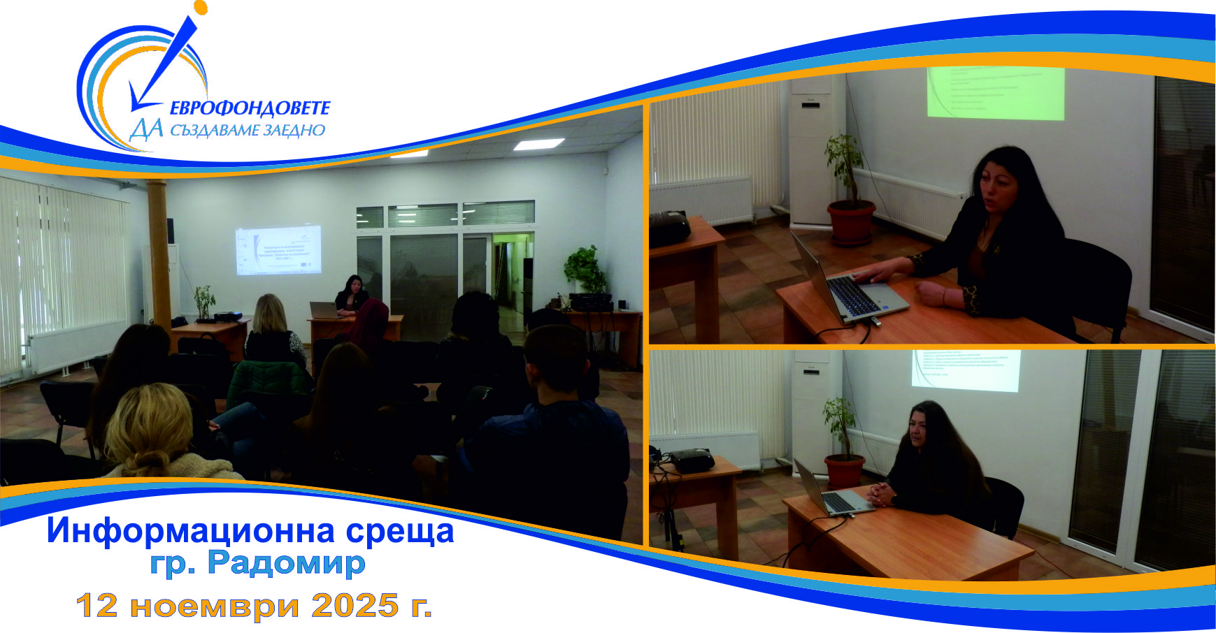 На 12.11.2025 г. в гр. Радомир бе проведен информационен ден, организиран от Областния информационен център – Перник. Темата на събитието бе „Актуални възможности по програмите, финансирани от Европейския съюз“. Участници в срещата бяха представители на образователни институции, общинска администрация и граждани.