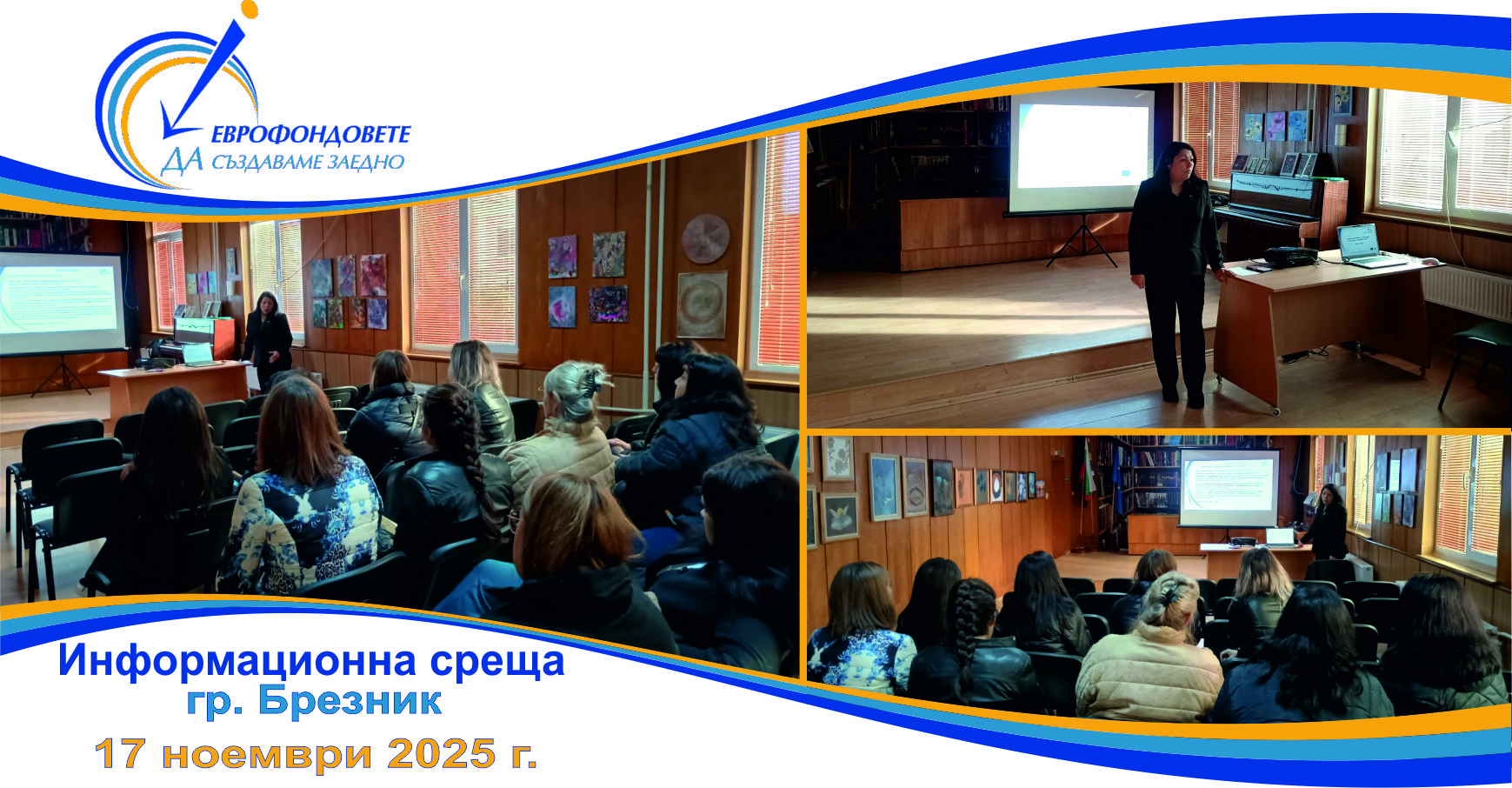На 17.11.2025 г. в гр. Брезник бе проведен информационен ден, организиран от Областния информационен център – Перник. Темата на събитието бе „Актуални възможности по програмите, финансирани от Европейския съюз“.