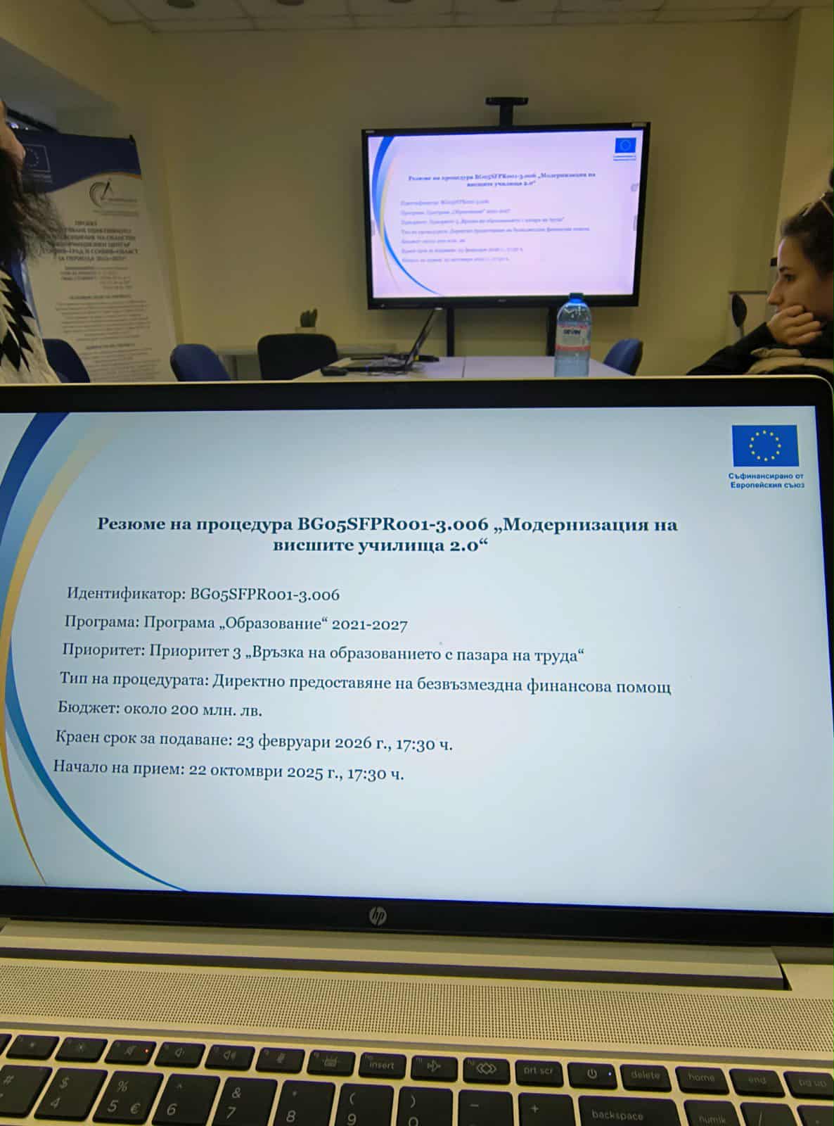 Акцент в дискусията бяха възможностите за финансиране на младежки инициативи и проекти. Студентите и младежите до 29 години научиха за актуални грантови схеми, които подпомагат развитието на висшето образование в България, както и за механизми за подкрепа на екологични и социални проекти.