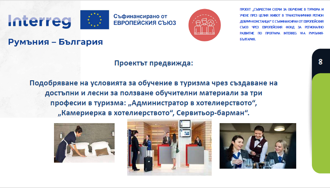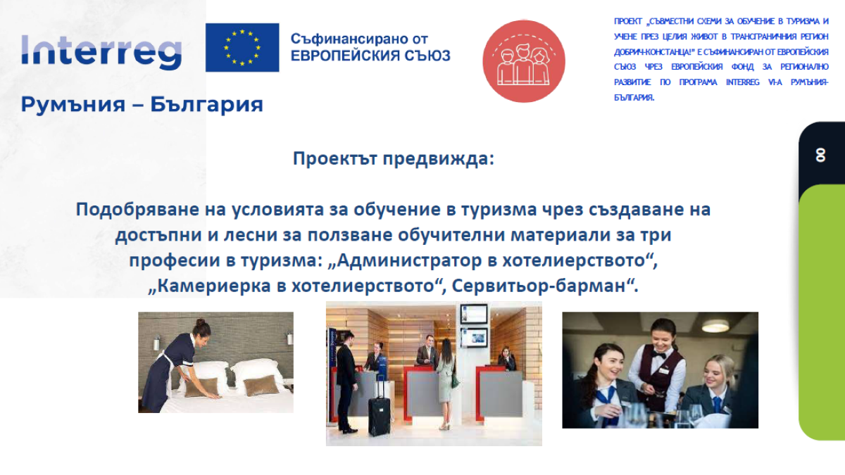 Общо 120 участника от област Добрич и окръг Констанца ще преминат шест обучителни курса, по два за всяка от трите професии, с продължителност от по 20 дни. Курсовете за администратори ще се провеждат в град Добрич, за камериерки в община Крушари, а за сервитьор-бармани в община Балчик. Курсовете ще приключат с петдневни стажове водени от ментори в гр. Констанца, Румъния за българските участници, и в България за румънските.Това ще даде възможност за реална професионална практика и усъвършенстване на езиковите умения.