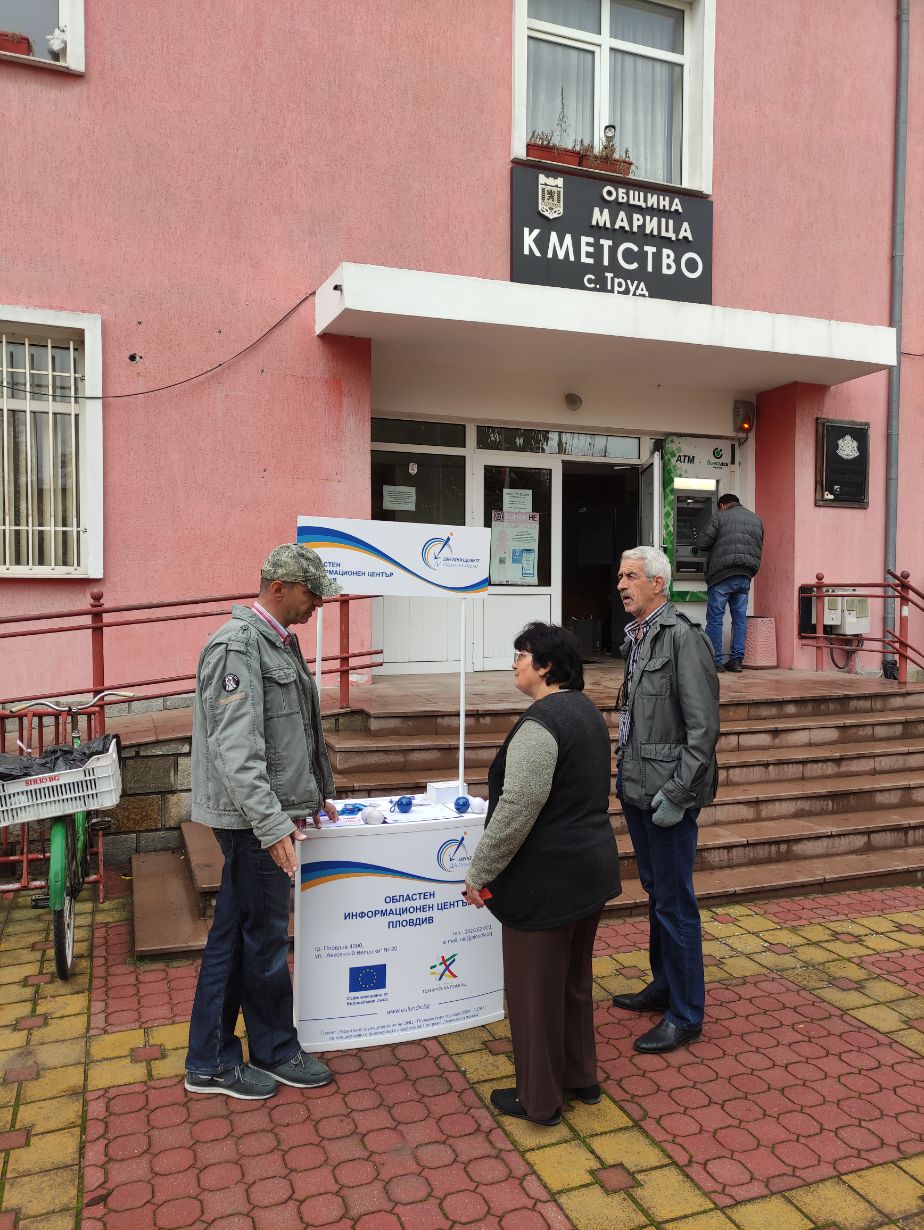 В периода 18 – 21 ноември 2025 г., екипът на Областен информационен център – Пловдив проведе открити приемни в четири населени места в областта. Гражданите на Перущица, Раковски, Стамболийски и с. Труд, община Марица, можеха да открият брандирания щанд на ОИЦ-Пловдив от 10:30 до 12:00 часа в посочените дни, където получиха безплатна информация относно актуалните и предстоящи възможности за финансиране от програмите, съфинансирани от Европейските фондове при споделено управление за периода 2021 – 2027 г., както и подхода Водено от общностите местно развитие.