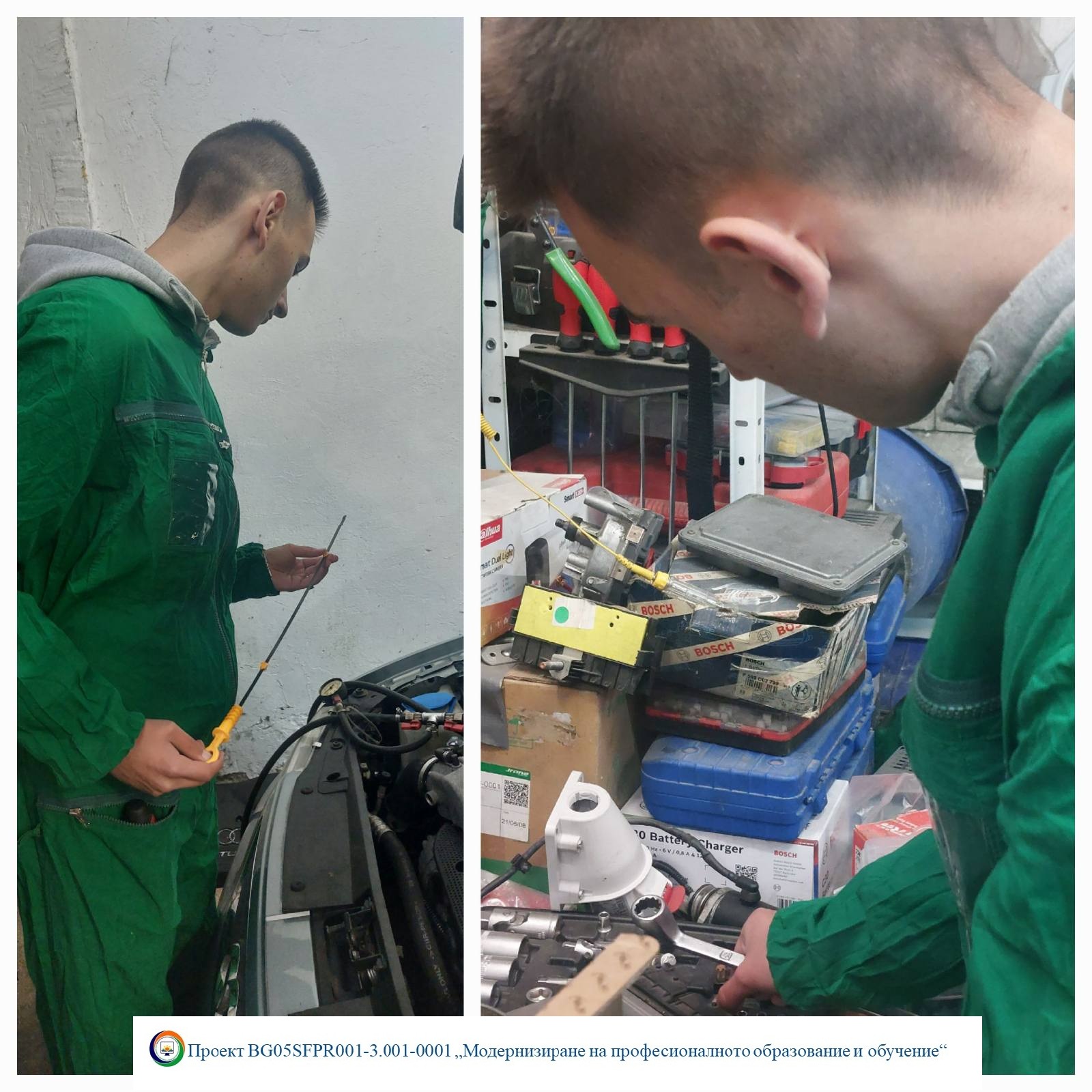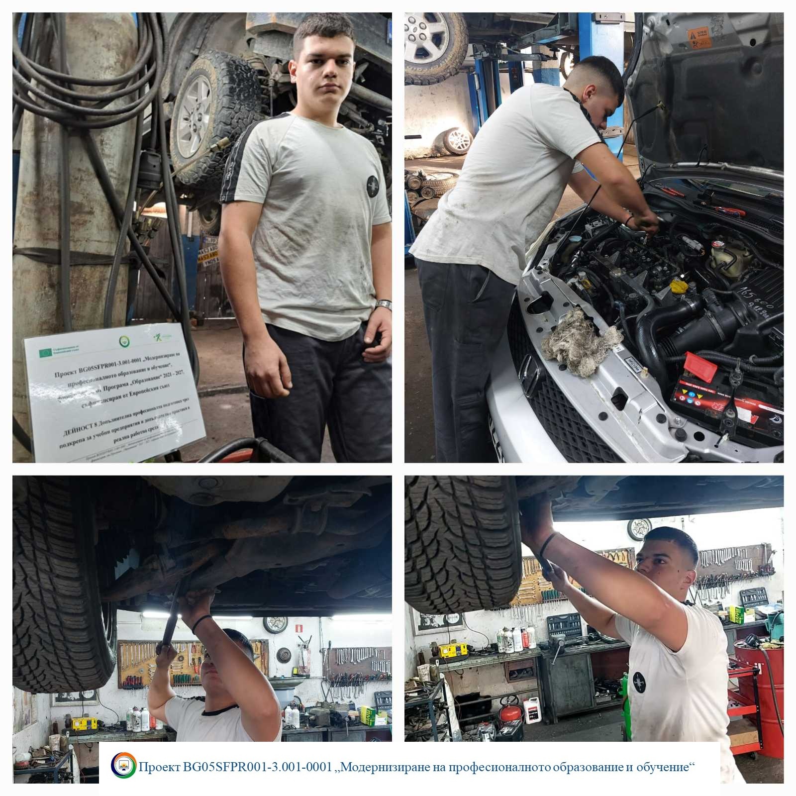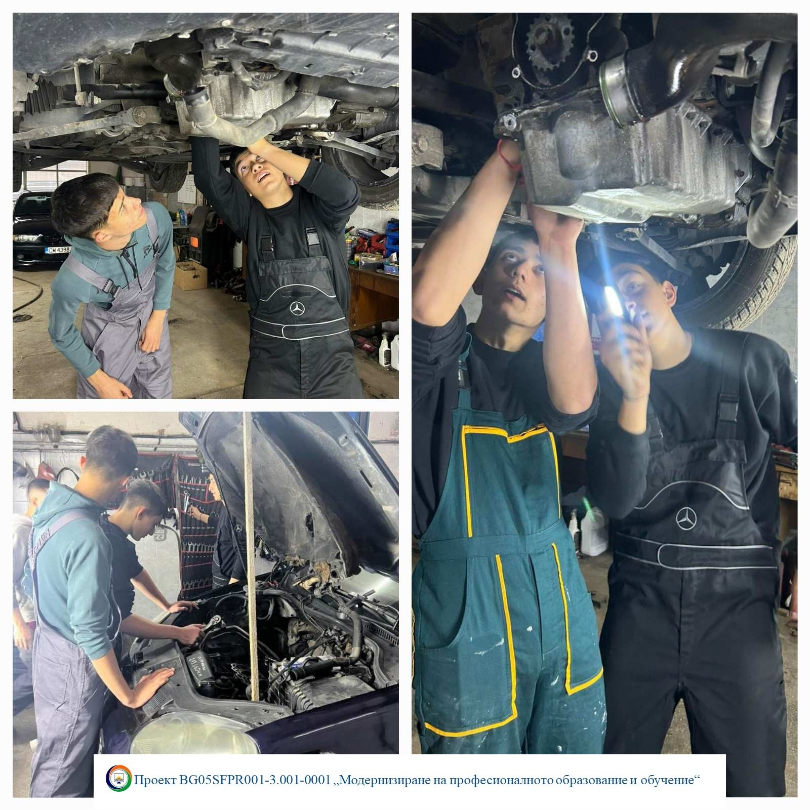 След запознаване с работното облекло и правилата за здравословни и безопасни условия на труд при работа в автосервиз започна провеждането на практическото обучение на групи ученици от 10 и 11 клас, специалност „Автотранспортна техника” в реална работна среда.