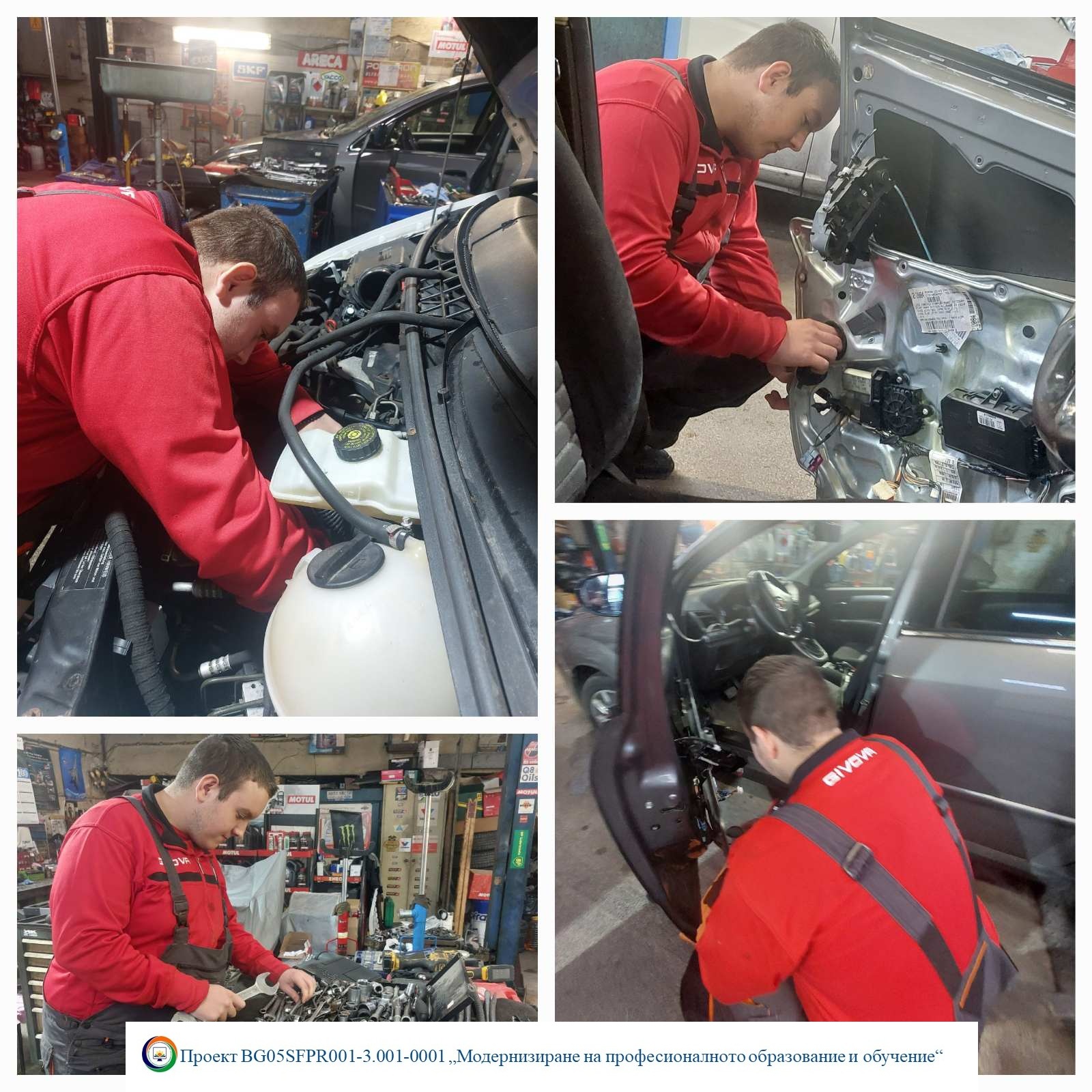 Чрез извършване на основни операции по демонтаж, ремонт, монтаж и техническо обслужване на двигатели, силово предаване, ходова част, системи за управление и електрообзавеждане на превозните средства, учениците придобиват необходимите практически умения, прилагайки наученото от учебните теоретични часове по обща, отраслова и специфична професионална подготовка в реална среда.