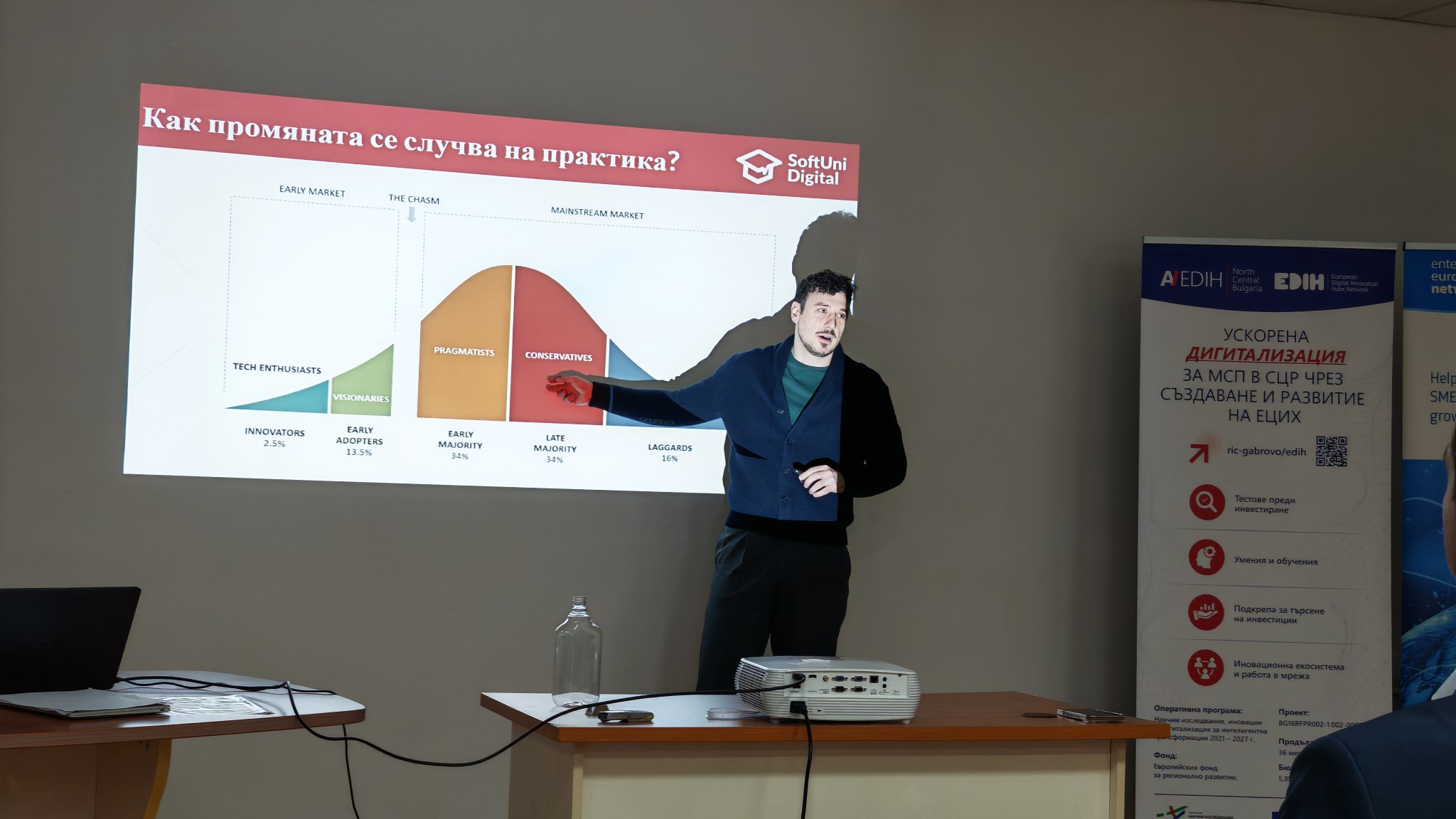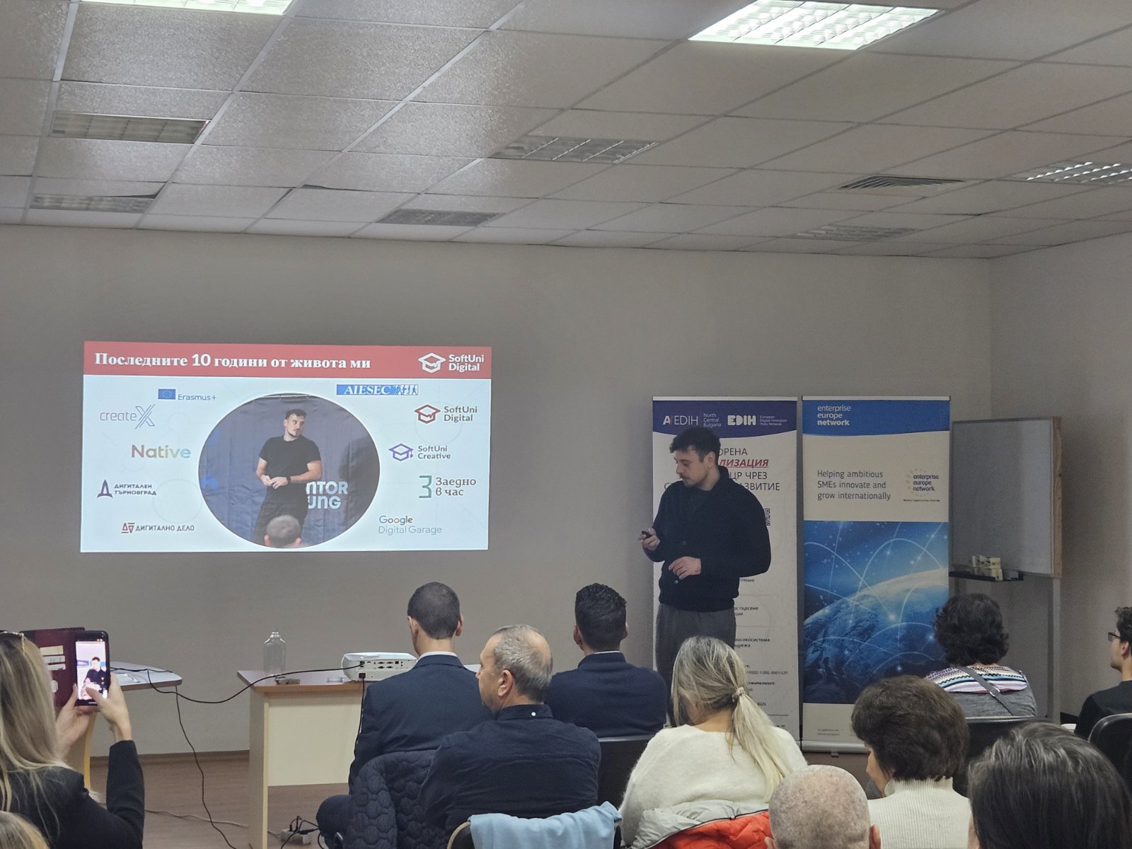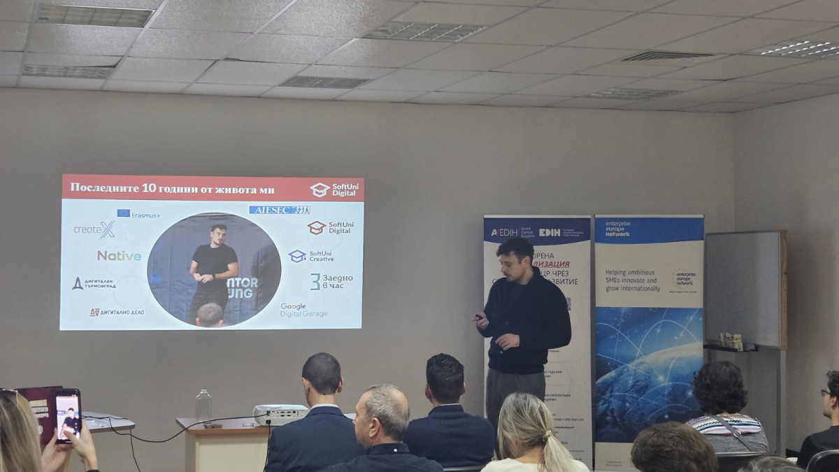 В следващия панел експертът на хъба Светослав Матев представи услугите, които ЕЦИХ предлага на бизнеса и администрацията – сред тях тестове преди инвестиция, оценка на цифрова зрялост, абонаментни внедрявания, обучения и лабораторни демонстрации. Особен акцент бе поставен върху факта, че микро, малките и средните предприятия имат достъп до тези услуги безвъзмездно като форма на държавна помощ „de minimis“, което значително намалява бариерите за внедряване на иновации.