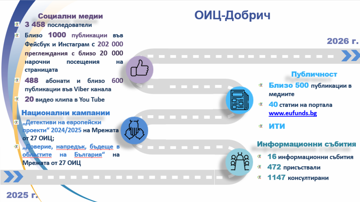 През годината, екипът на ОИЦ-Добрич проведе успешно кампаниите „Детективи на европейски средства“ 2024/2025 и „Доверие, напредък, бъдеще в областите на България“ на Мрежата от 27 областни информационни центъра. През месец май младежите от Общинския консултативен съвет по въпросите за младежта към Кмета на Община град Добрич, в ролята на „детективи“ представиха резултата от своето няколкомесечно проучване, посветено на успешно реализирания проект на предприятие в град Добрич. Видеото от проучването е налично на следния линк: https://youtu.be/CZtE6DRvBF4.  В периода септември - октомври Мрежата от 27 Областни информационни центъра реализира успешно онлайн фейсбук кампания, чрез която бяха популяризирани над 250 успешно реализирани проекта, финансиране от ЕС в България.