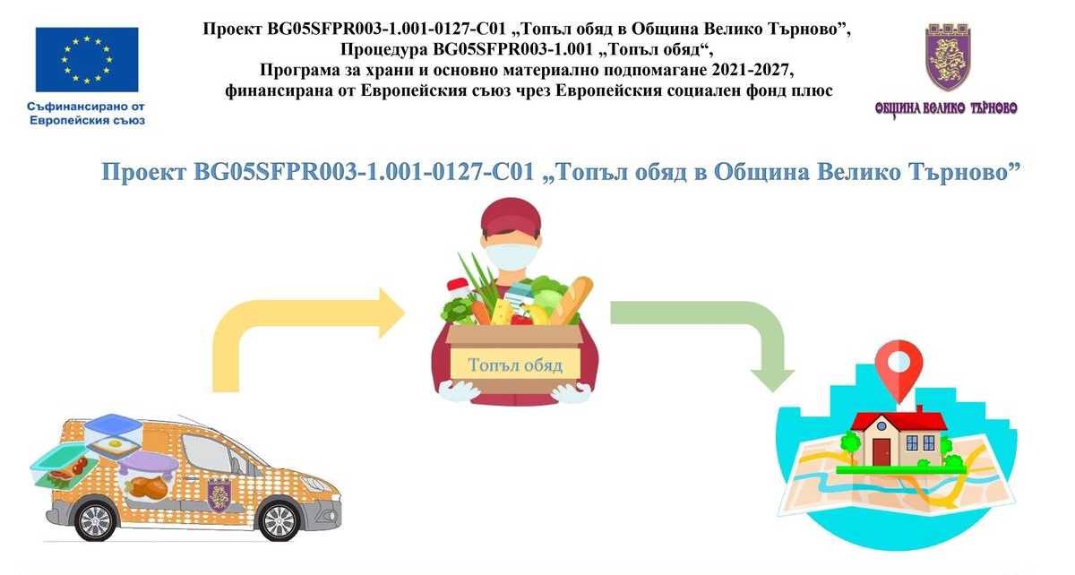 Във връзка с увеличаване на финансовия ресурс на Програма за храни и основно материално подпомагане 2021-2027 г., срокът за реализация на Проект „Топъл обяд в Община Велико Търново”, финансиран от Процедура BG05SFPR003 „Топъл обяд“, се удължава с 8 месеца – до 30.09.2026 г. Удължаването е резултат на възможността, която беше предоставена от страна на Управляващия орган на Програмата.