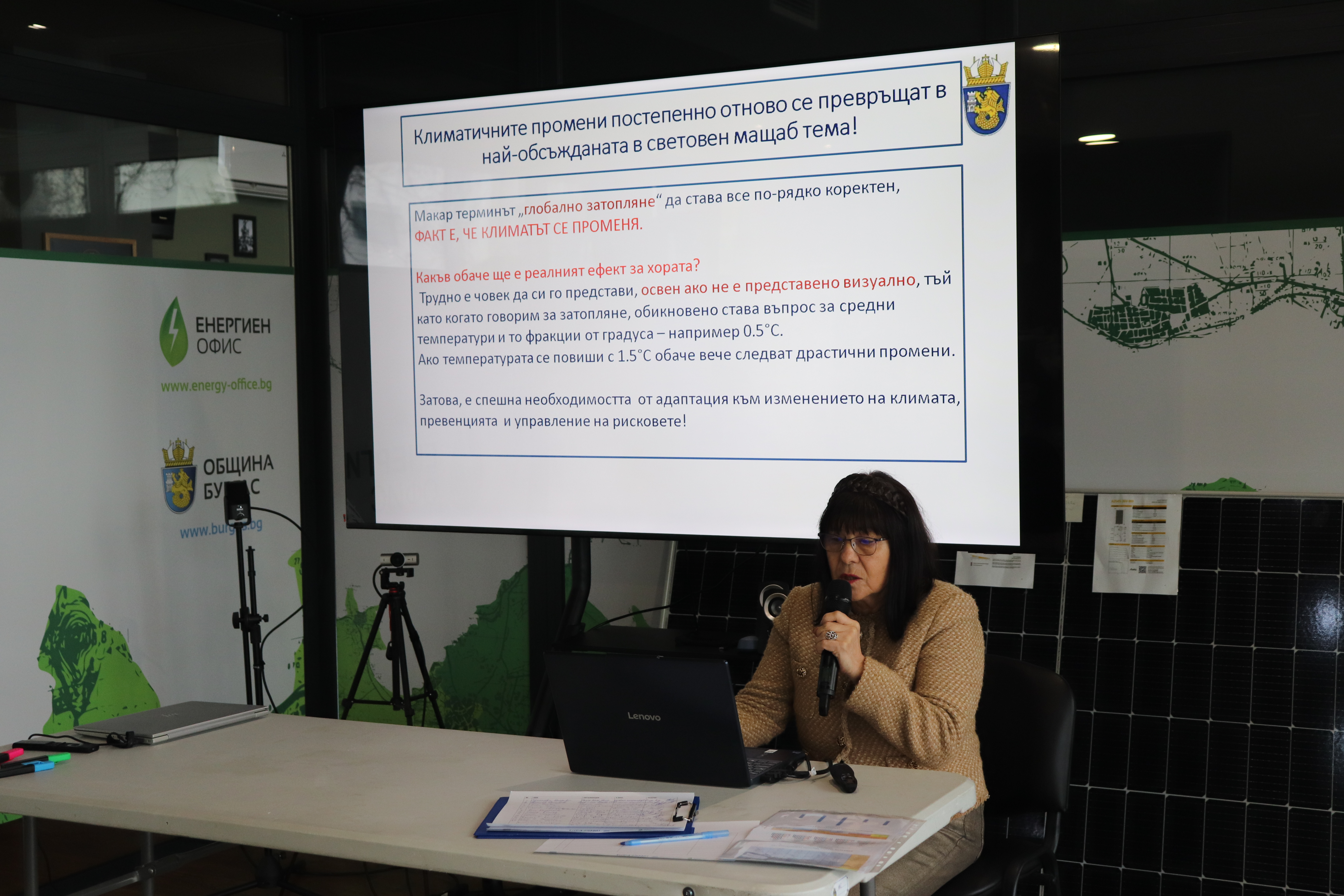 В срещата участваха представители на Община Бургас, Областна администрация - Бургас, Областен информационен център – Бургас, висши учебни заведения, местния бизнес и експерти в областта на устойчивото развитие. Основен акцент беше поставен върху интегрирането на мерки за климатична адаптация в местните стратегически документи и бъдещите възможности за финансиране със средства от Европейския съюз.