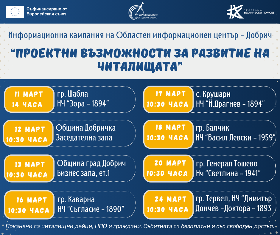 През месец март 2026 г. екипът на Областен информационен център – Добрич ще проведе поредица от информационни срещи на тема „Проектни възможности за развитие на читалищата“. Те ще бъдат насочени към повишаване на информираността на читалищата, неправителствените организации и други заинтересовани. Събитията са безплатни и със свободен достъп. Информационните срещи ще бъдат проведени както следва: